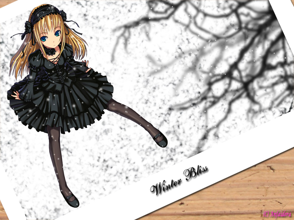 Description: A drawing of a girl in a black dress and a hat with a tree in the background and a snow covered ground.