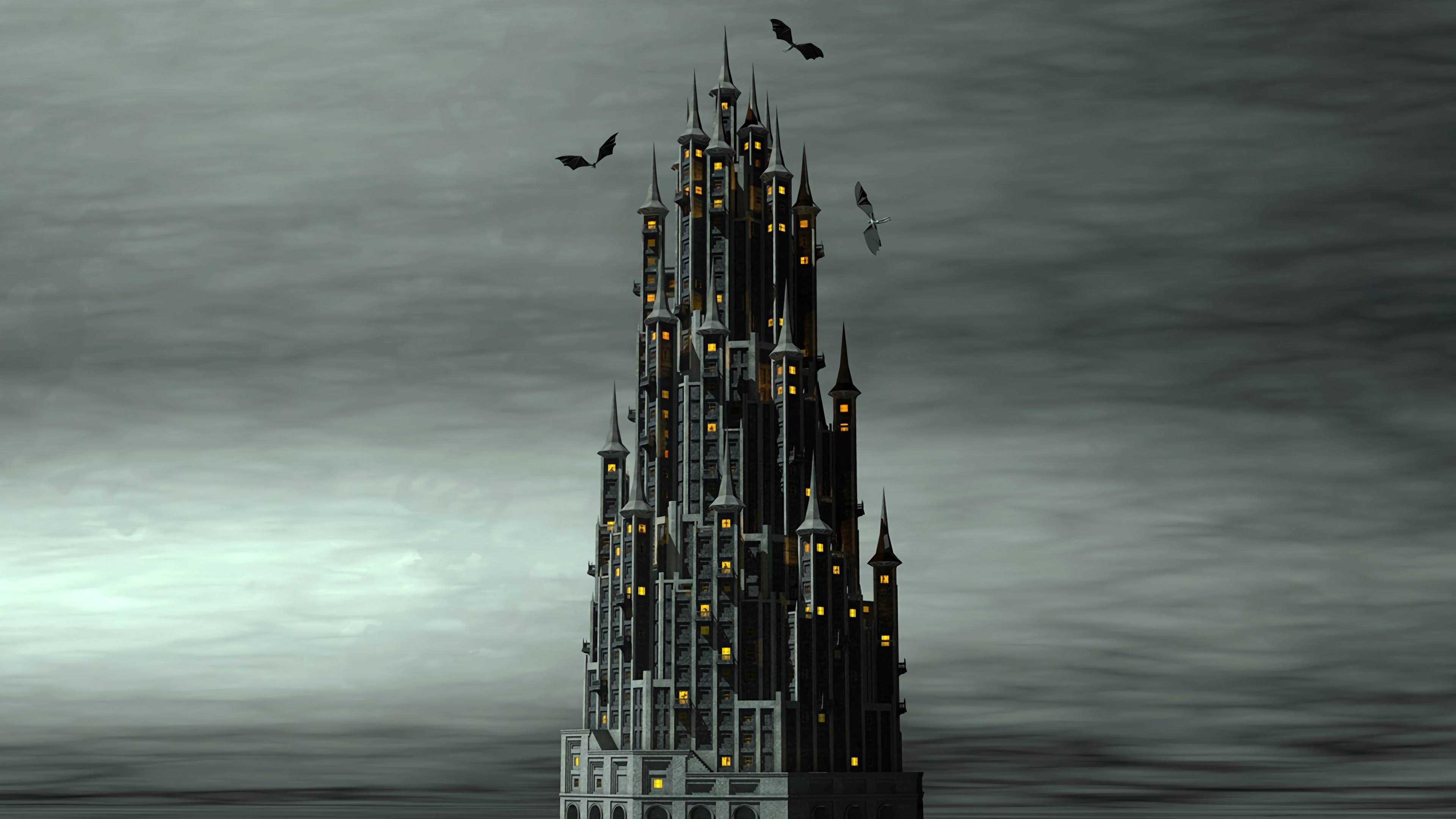 Description: A very tall building with a lot of lights on it's sides and a bird flying over it.