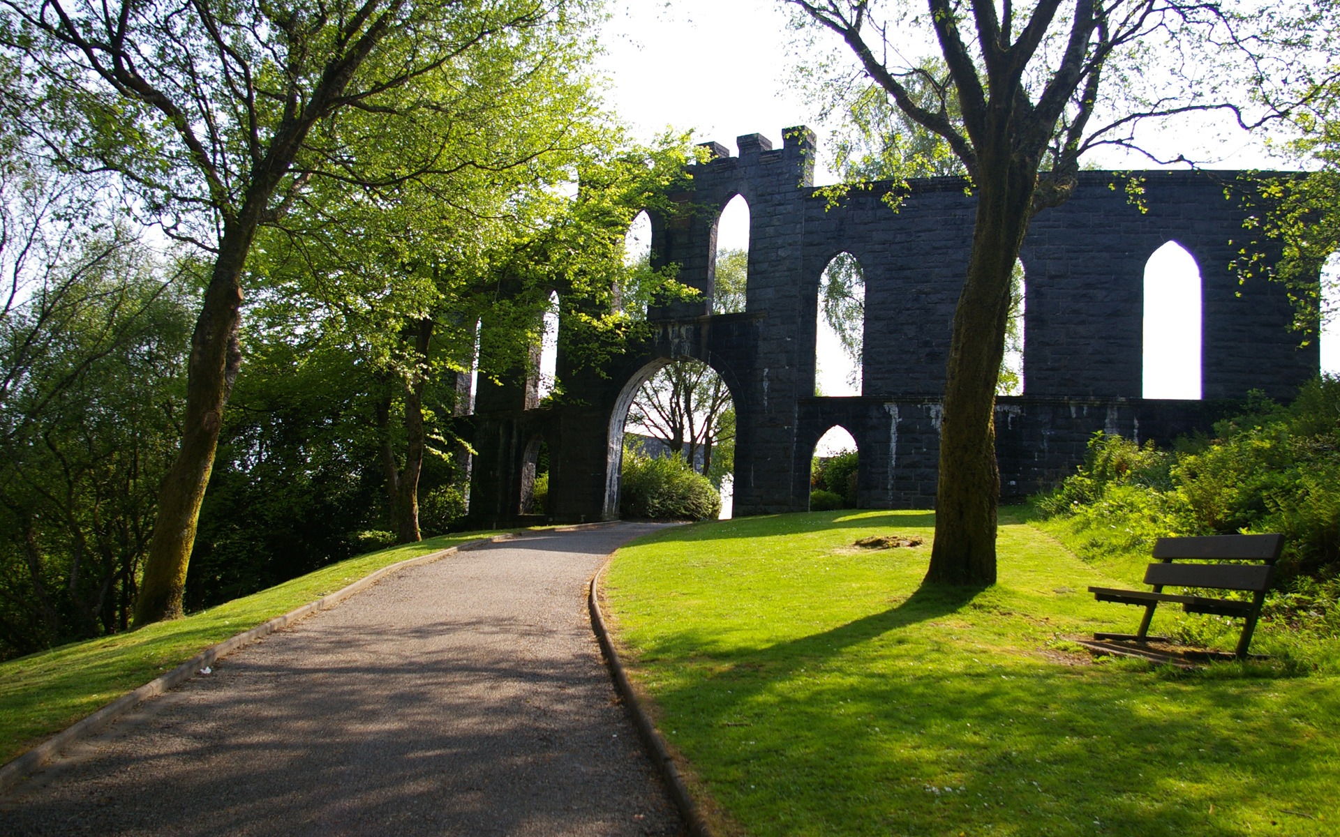 Description: A bench sitting on a lush green park next to a tall building with arched windows and arched arches on the side.