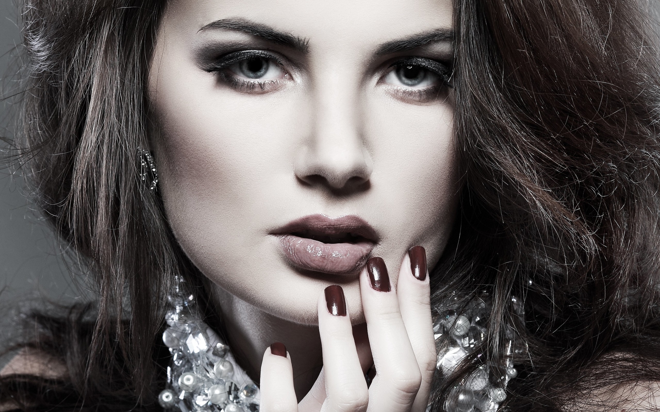 Description: A woman with a necklace and ring on her finger posing for a picture with her hands on her face.