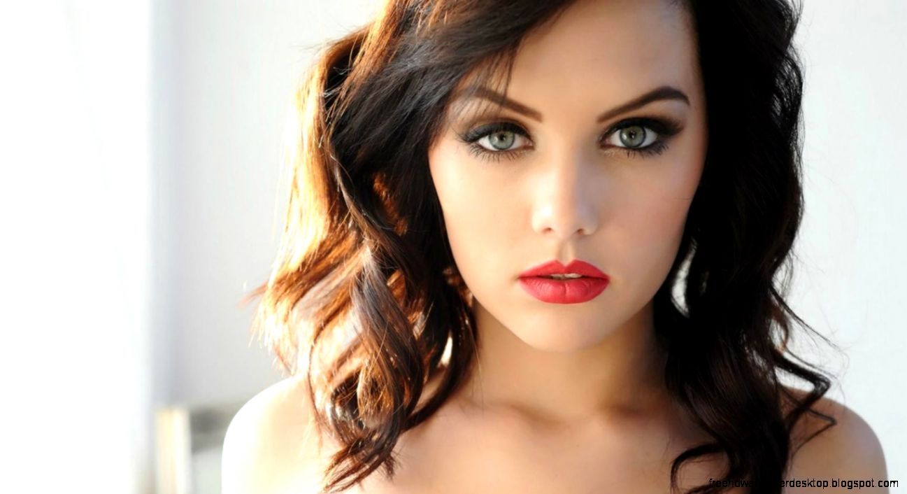 Description: A woman with long hair and blue eyes wearing a red lipstick and a white dress with a black top.