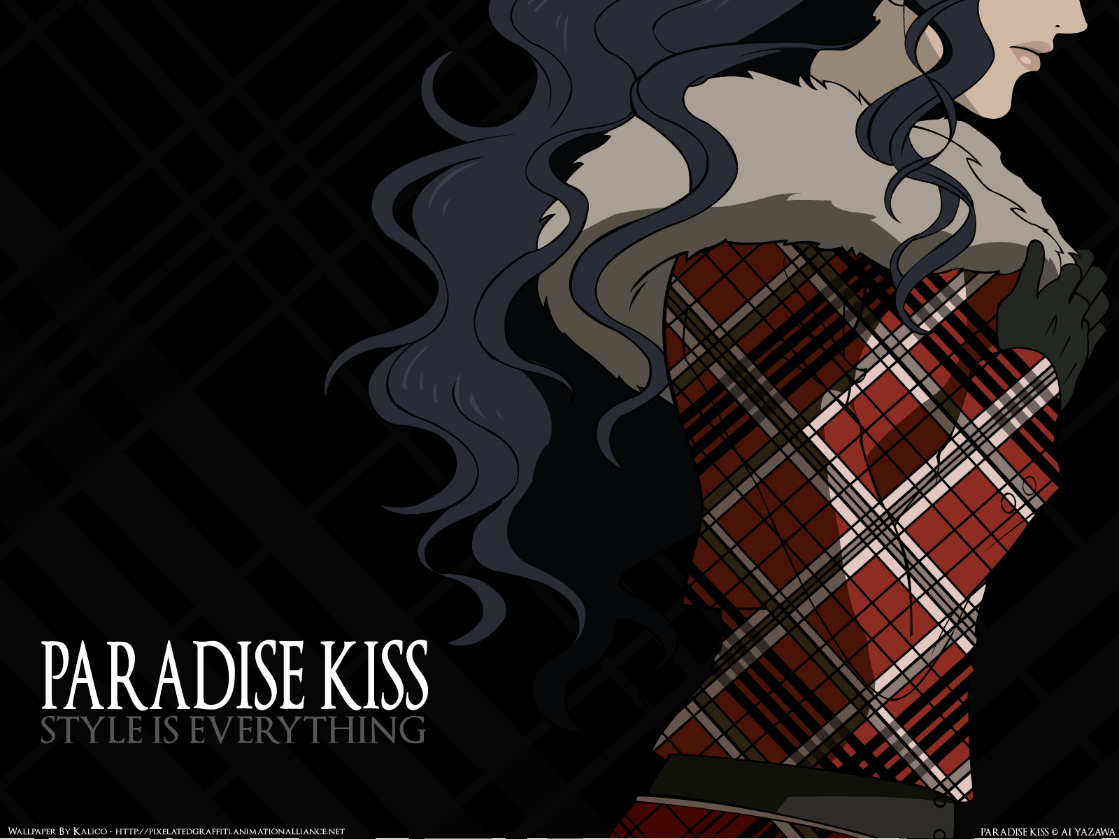Description: A woman with long hair wearing a plaid dress and a black background with a black and white checkered pattern.