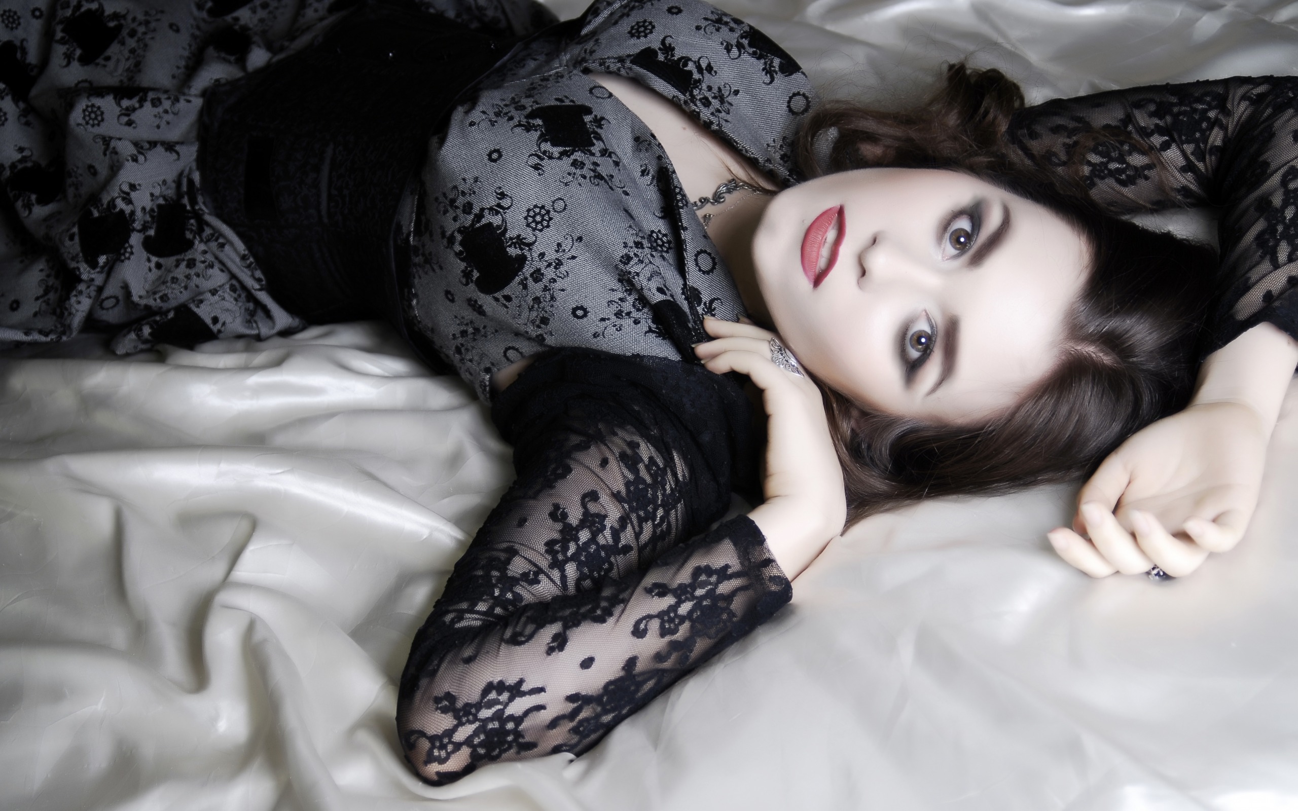 Description: A woman laying on a bed wearing black lingerie and stockings with her hands on her hips and her legs crossed.