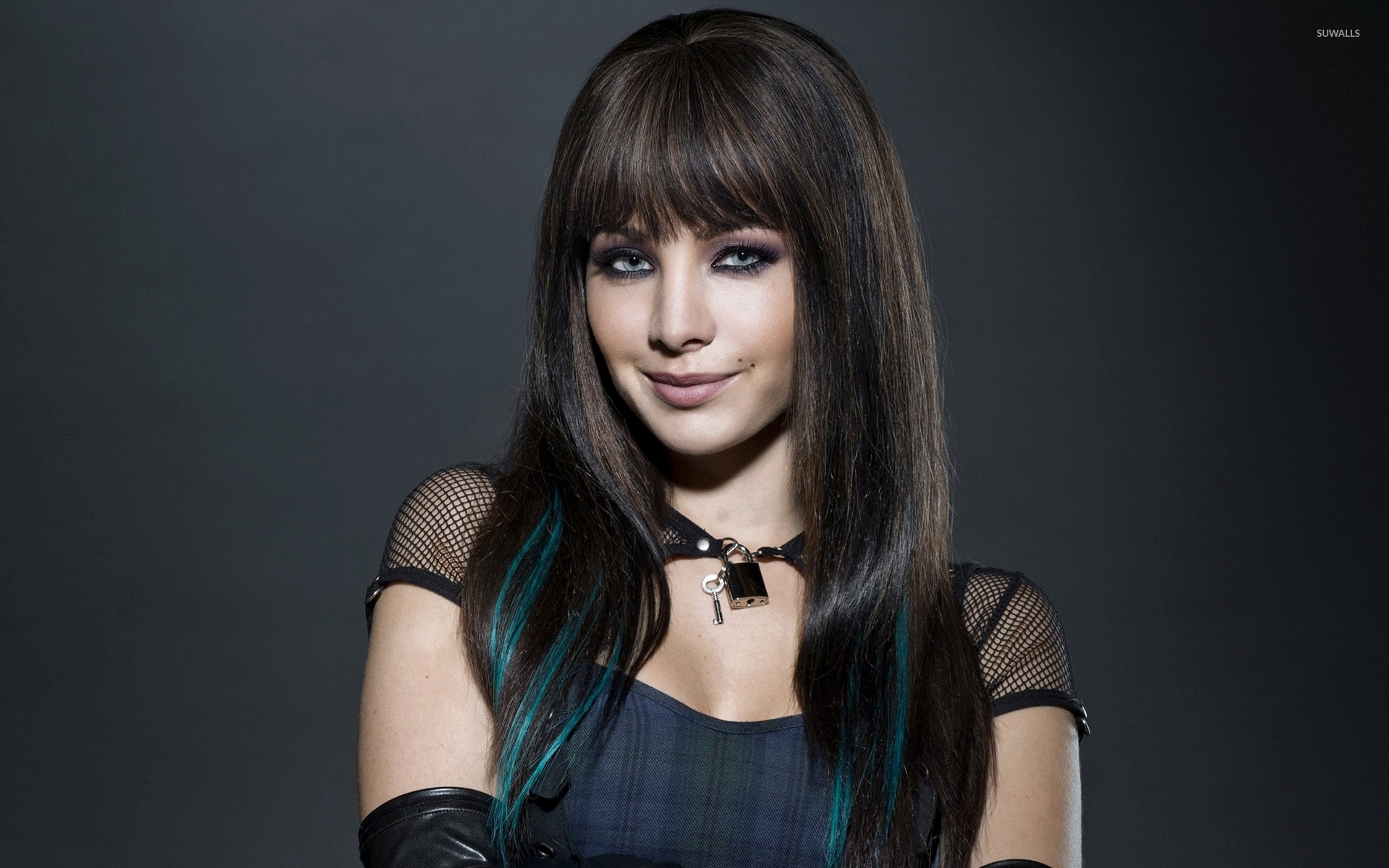 Description: A woman with long hair and black gloves on her chest and a black shirt on her chest and a black background.