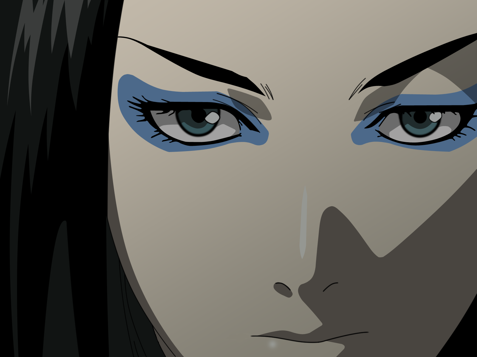 Description: A woman with blue eyes and long black hair is staring at the camera with a serious look on her face.