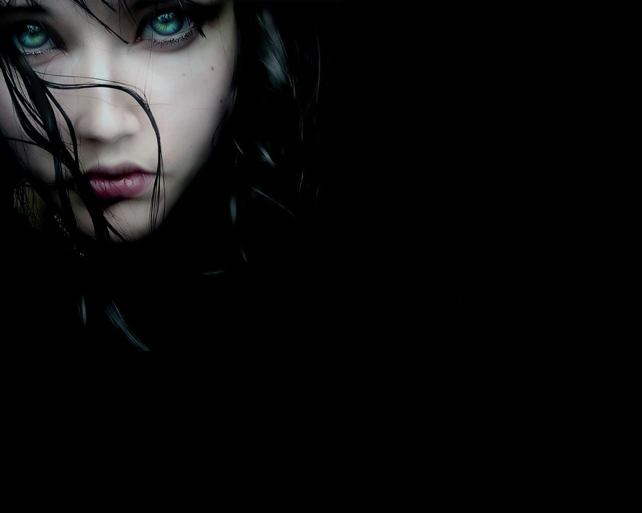 Description: A woman with blue eyes and long hair in the dark with a black background and a black hat on her head.