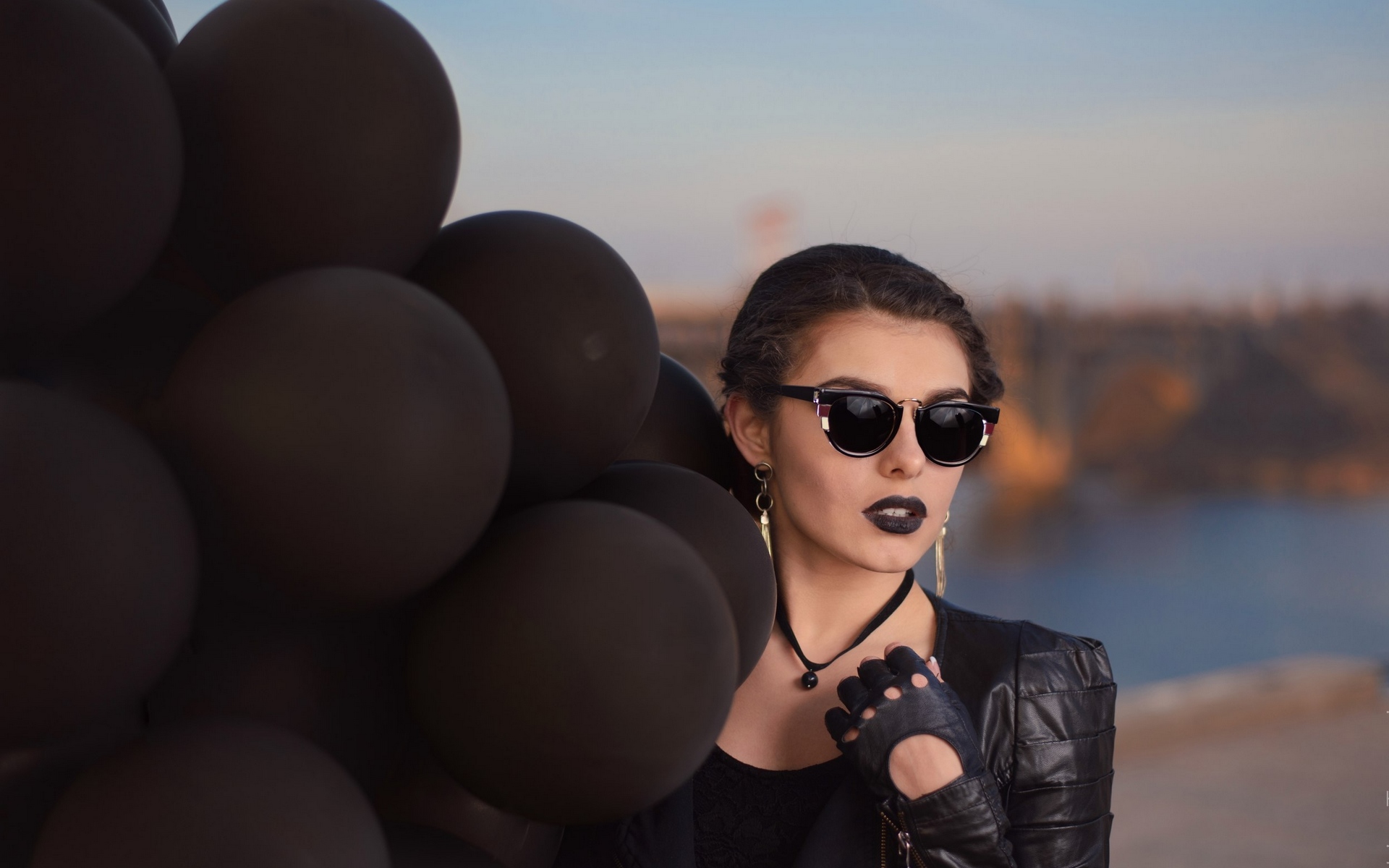 Description: A woman wearing sunglasses and a black leather jacket with a black necklace and black gloves on her shoulder and a black leather jacket on her shoulder.