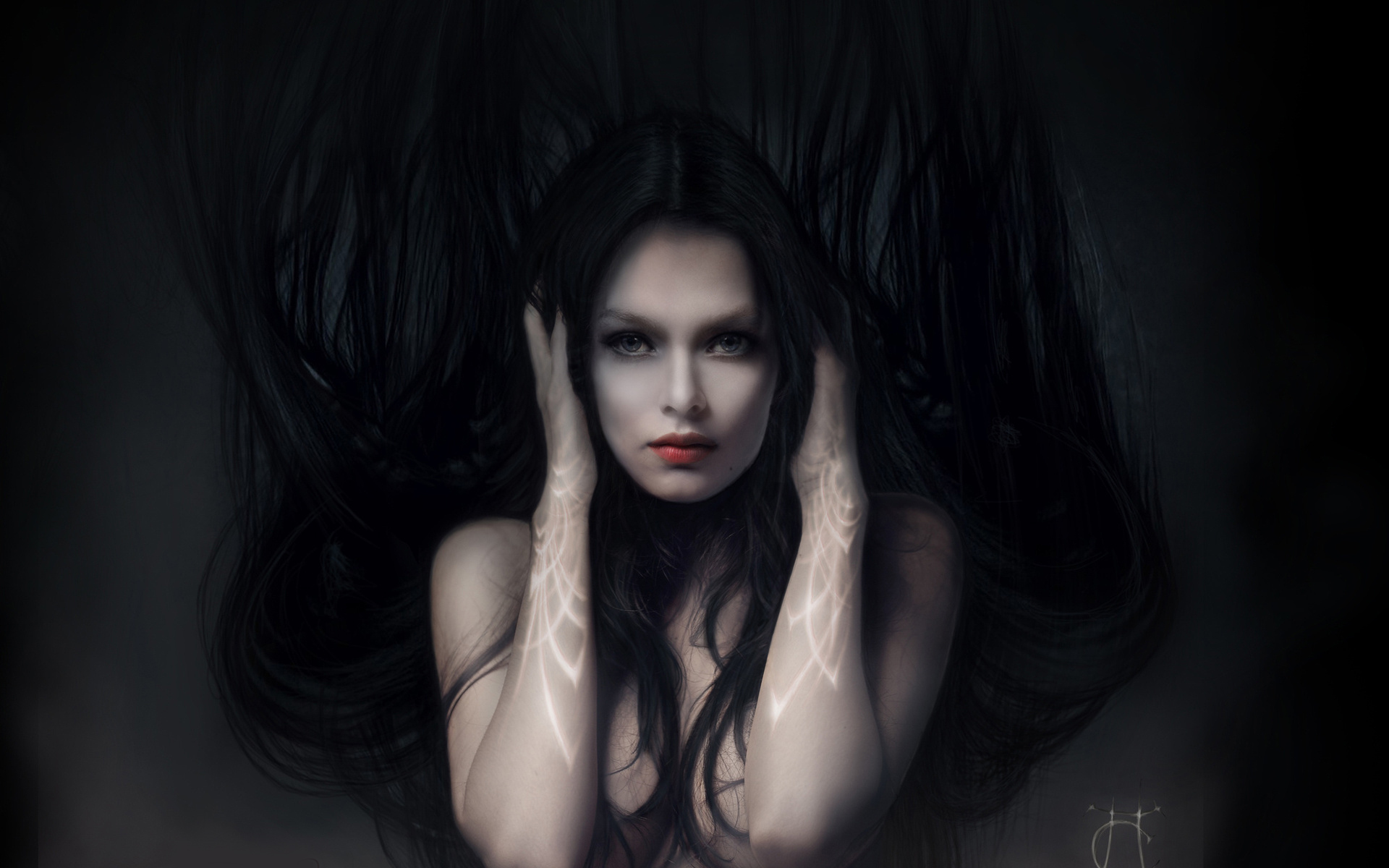 Description: A woman with long hair and red lipstick posing for a picture with her hands on her head and her hands on her head.