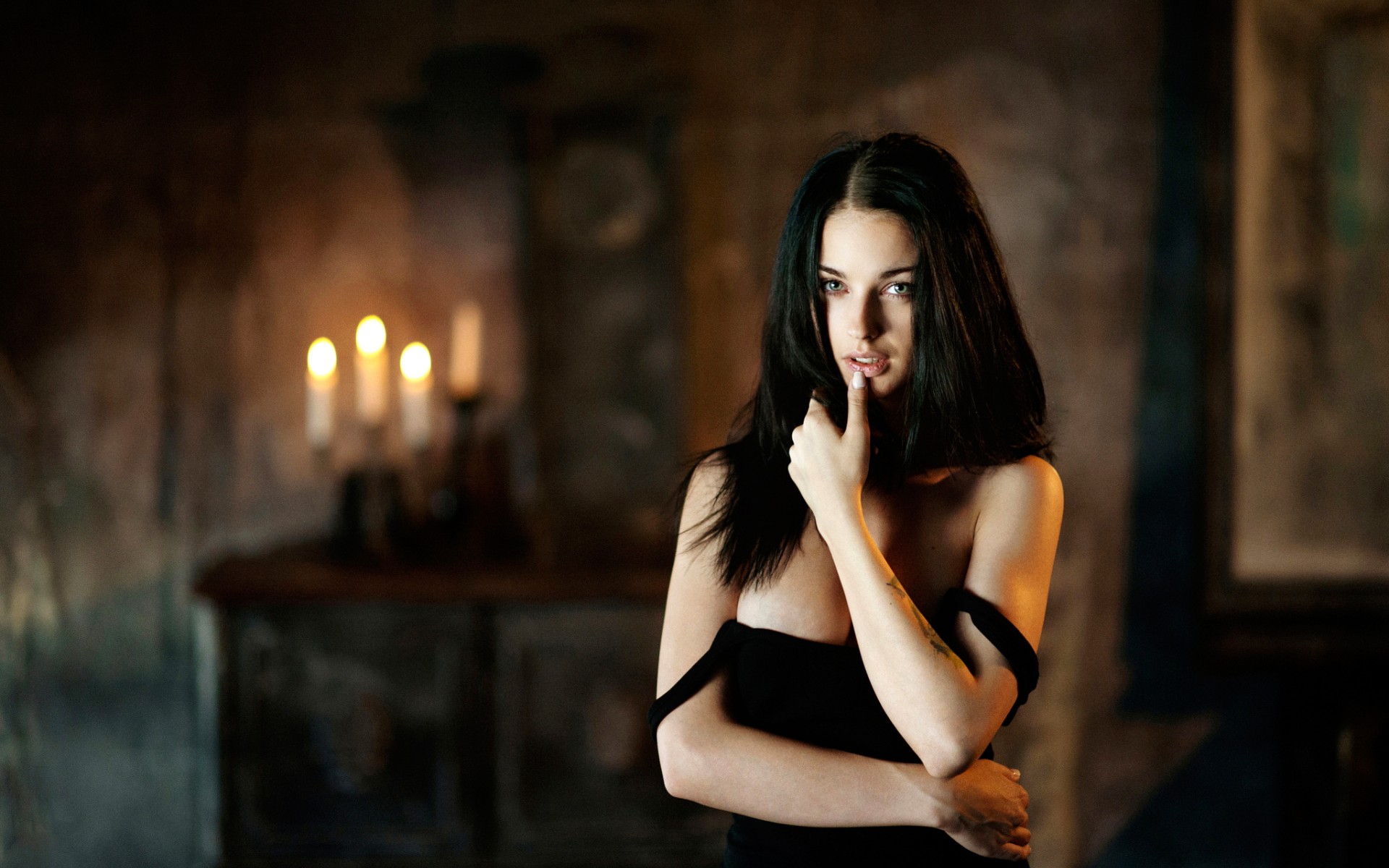 Description: A woman in a black dress is posing for a picture with candles in the background and a table with candles on it.
