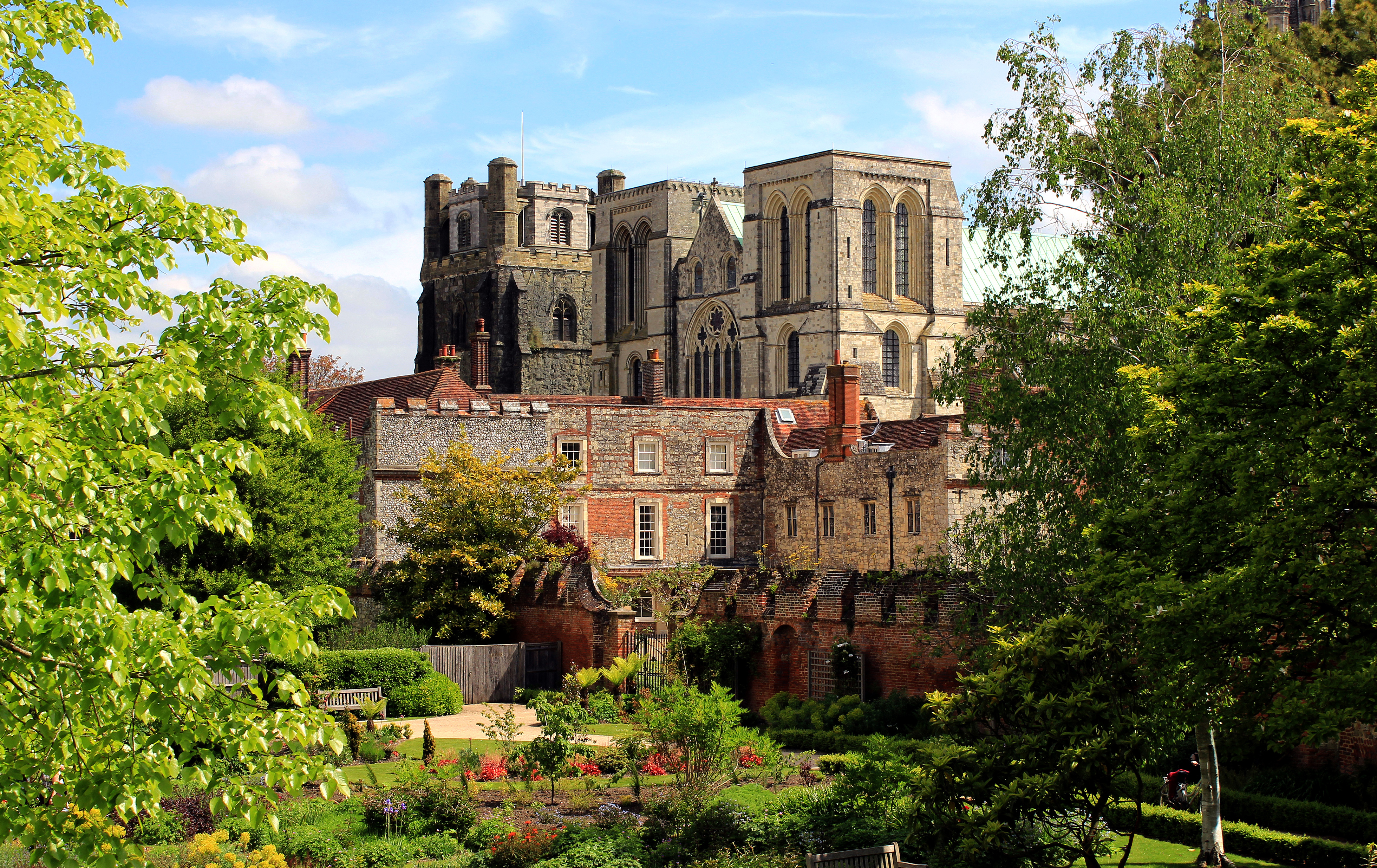Description: A large building with a tower and a clock on it's side surrounded by trees and bushes and a park.