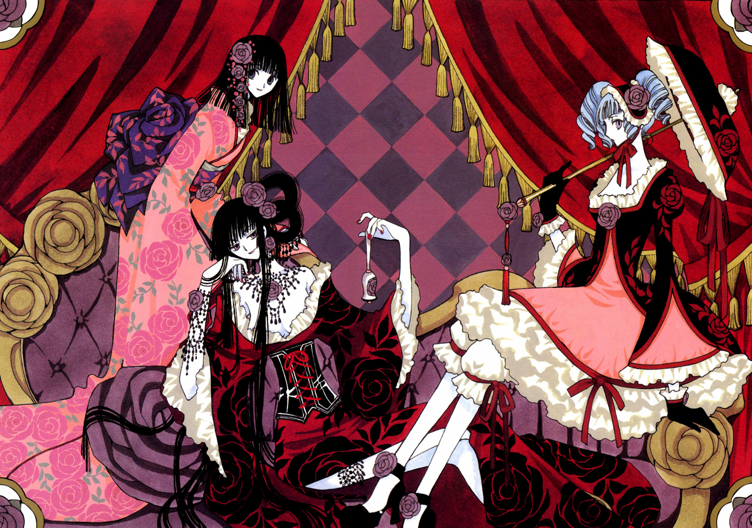 Description: A painting of two women in fancy dresses sitting on a couch with a dog in front of them and a man standing next to them.