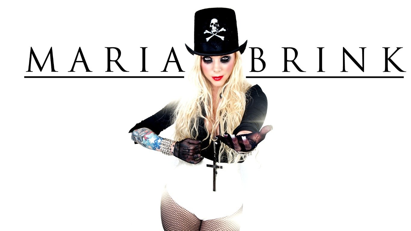 Description: A woman in a black hat and white outfit with a tattoo on her arm and a black top hat.