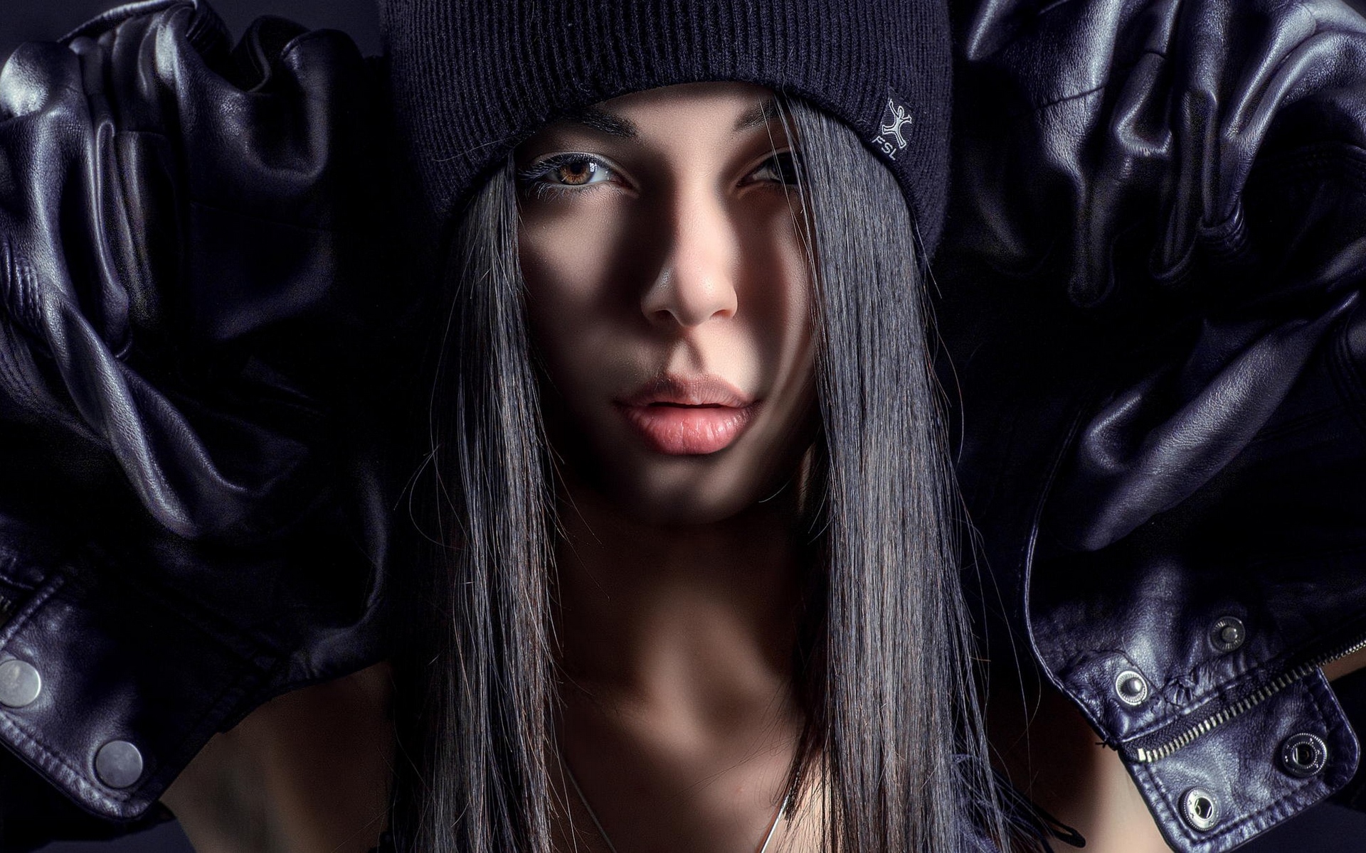 Description: A woman with long hair wearing a black hat and jacket with her hands on her head and a black jacket on her shoulders.