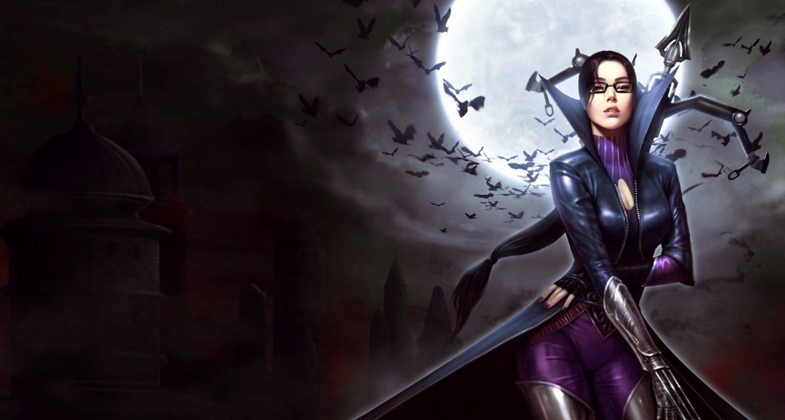 Description: A woman in a purple outfit holding a gun in front of a full moon with bats flying around her.