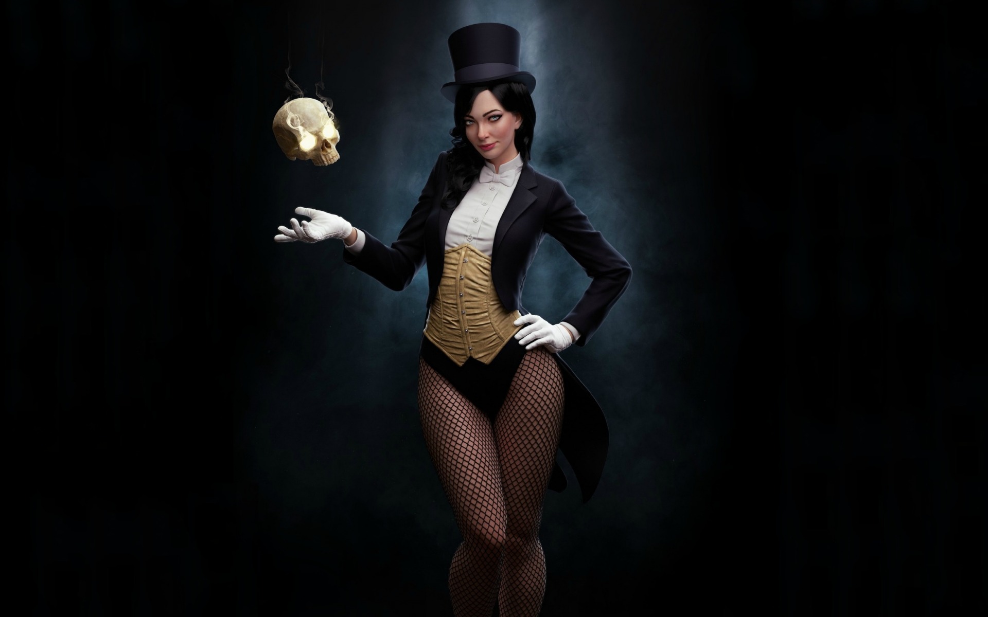 Description: A woman in a costume holding a skull and a golden object in her hand.