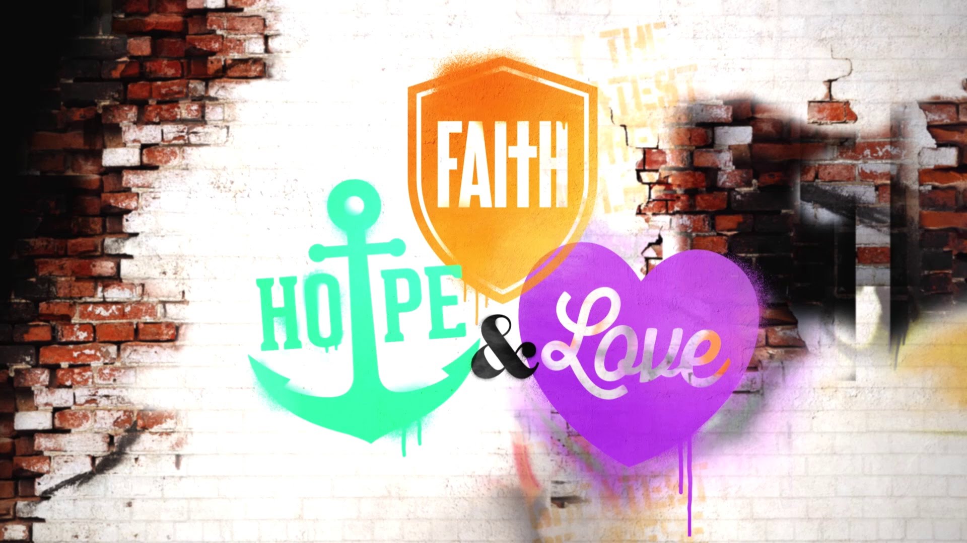 Description: A wall with some graffiti on it and a heart and a shield with the word faith and hope painted on it.