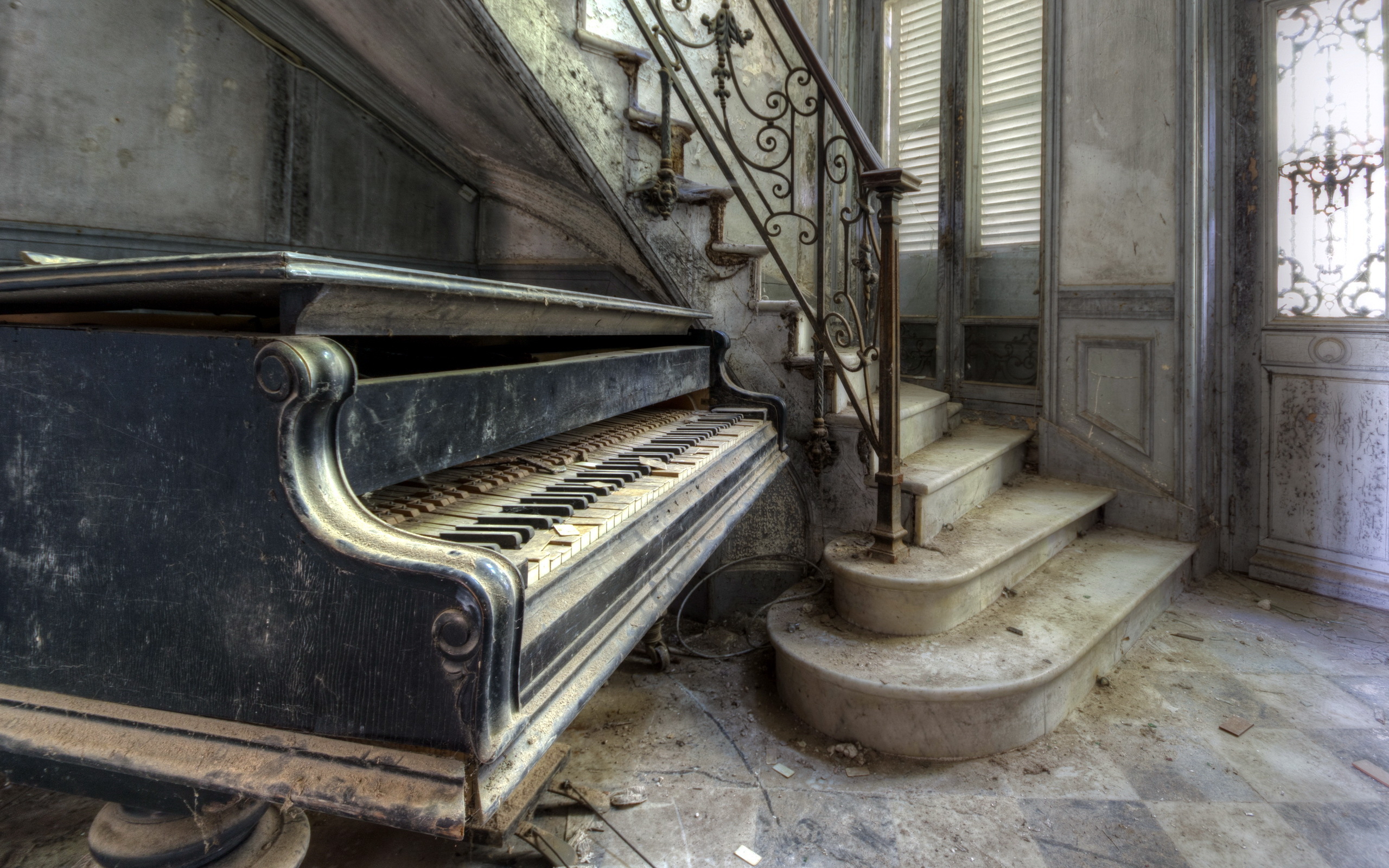 Description: A grand piano sitting in a room with a staircase and a window in the background with a curtained window.