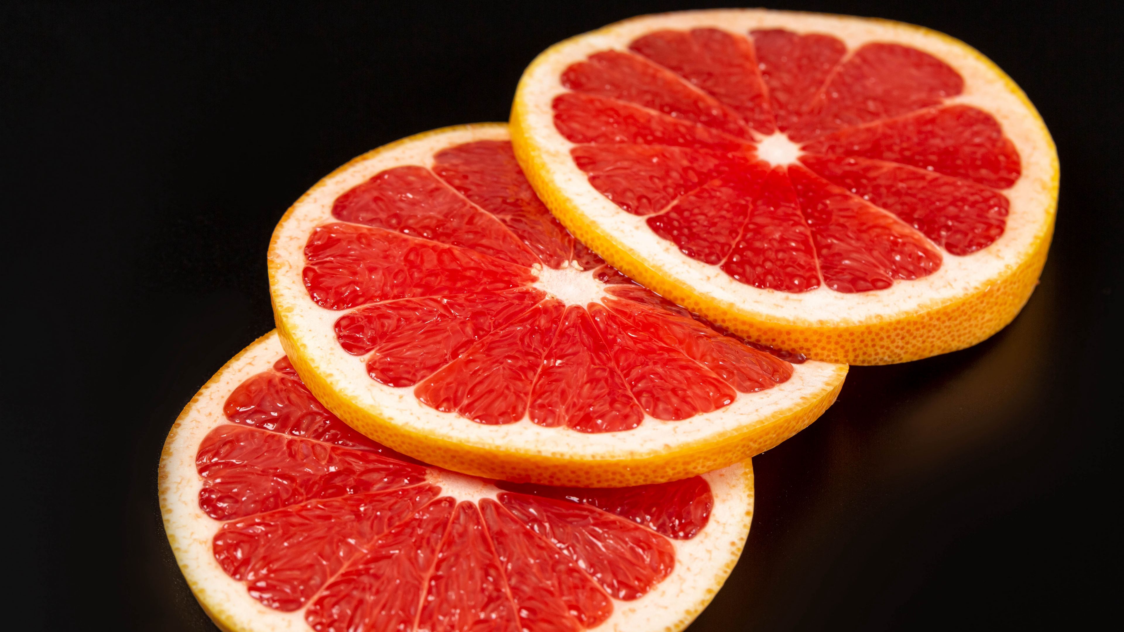 Description: Three grapefruit slices are shown on a black surface.