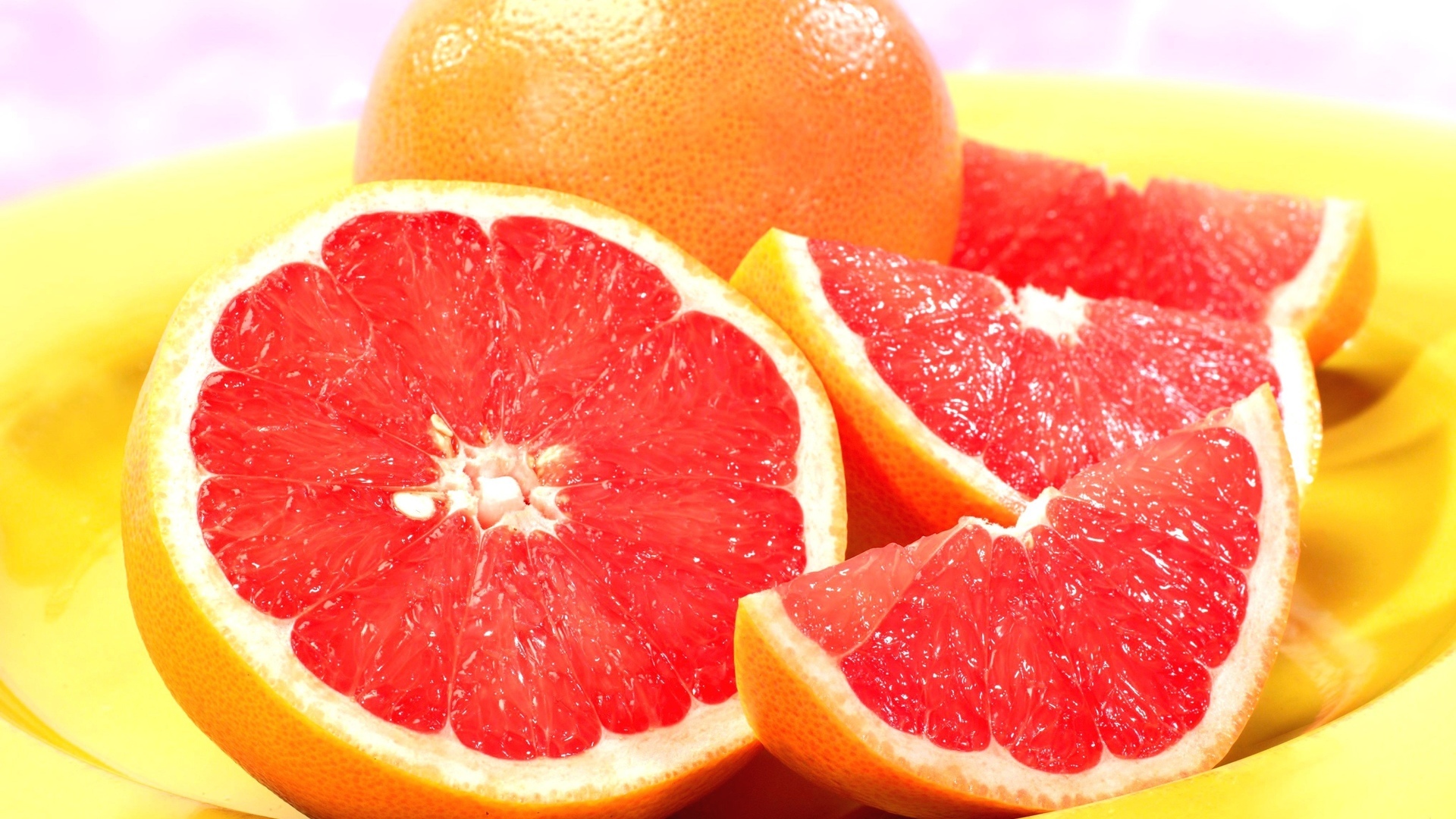 Description: A plate of grapefruits cut in half on a yellow plate with a blue background and a white stripe.