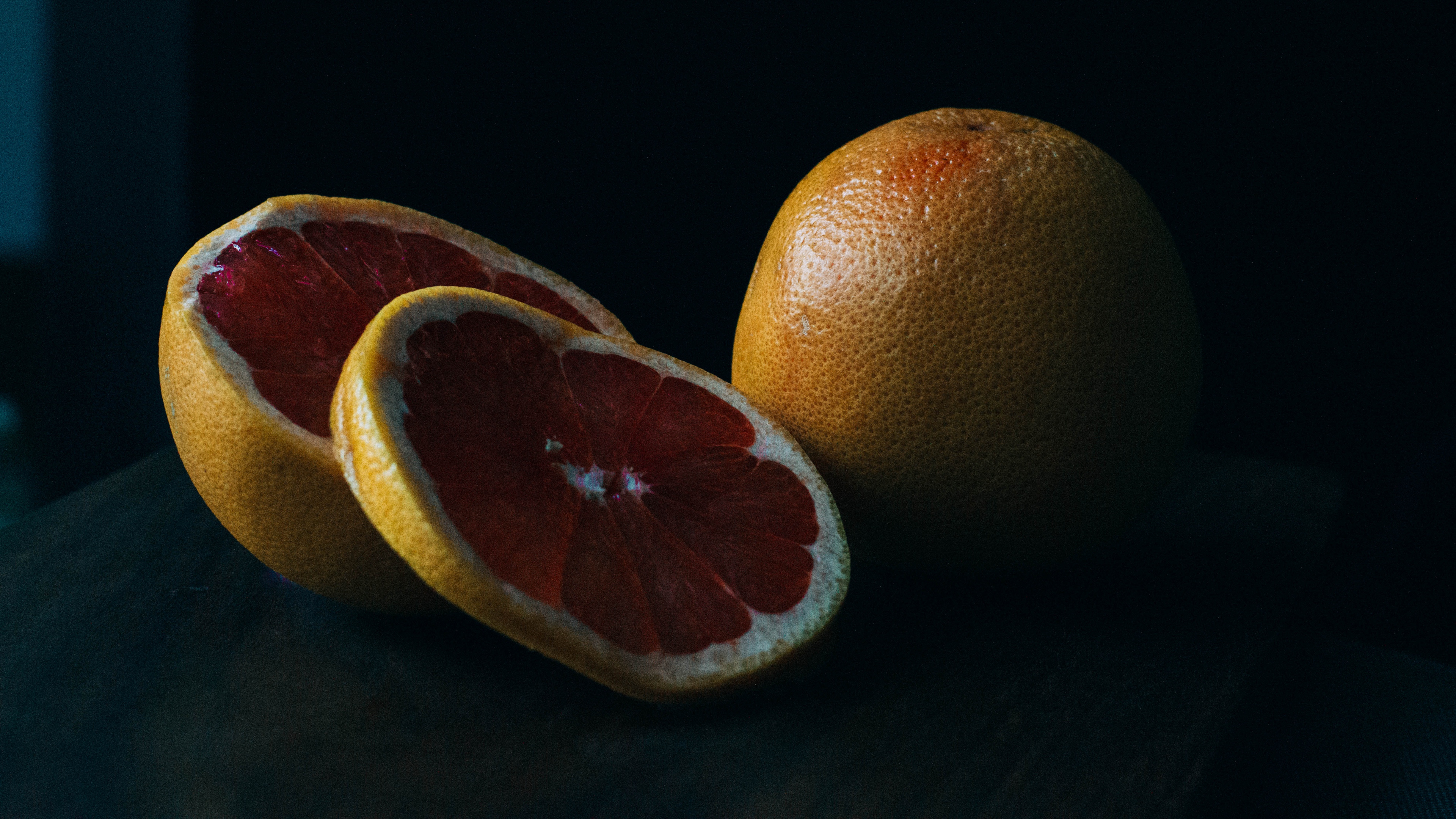 Description: Two grapefruits sitting on a table with one cut in half and the other half open to show the inside.
