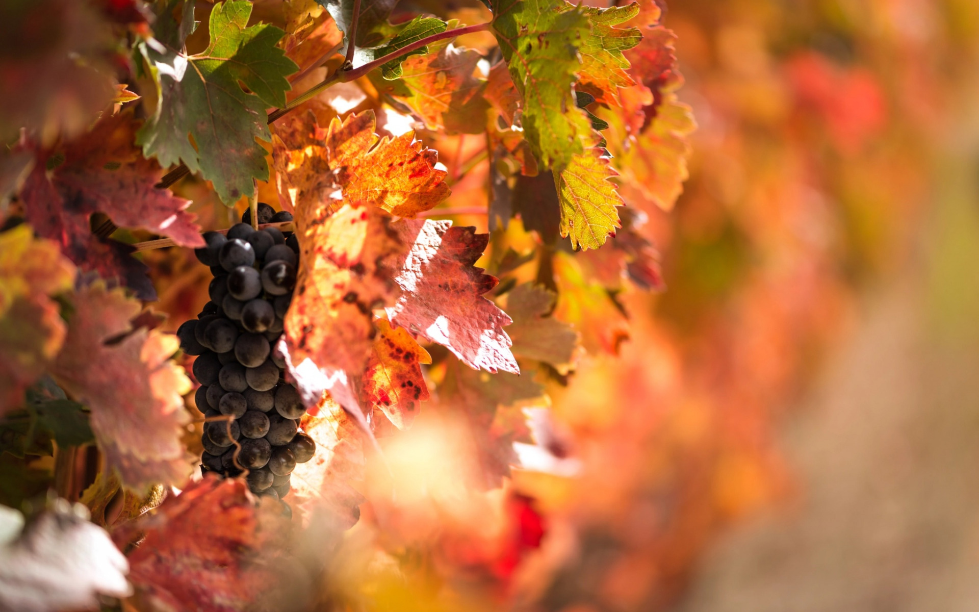 Description: A bunch of grapes hanging from a vine in a vineyard with autumn leaves in the background and a blurry image of the vine.
