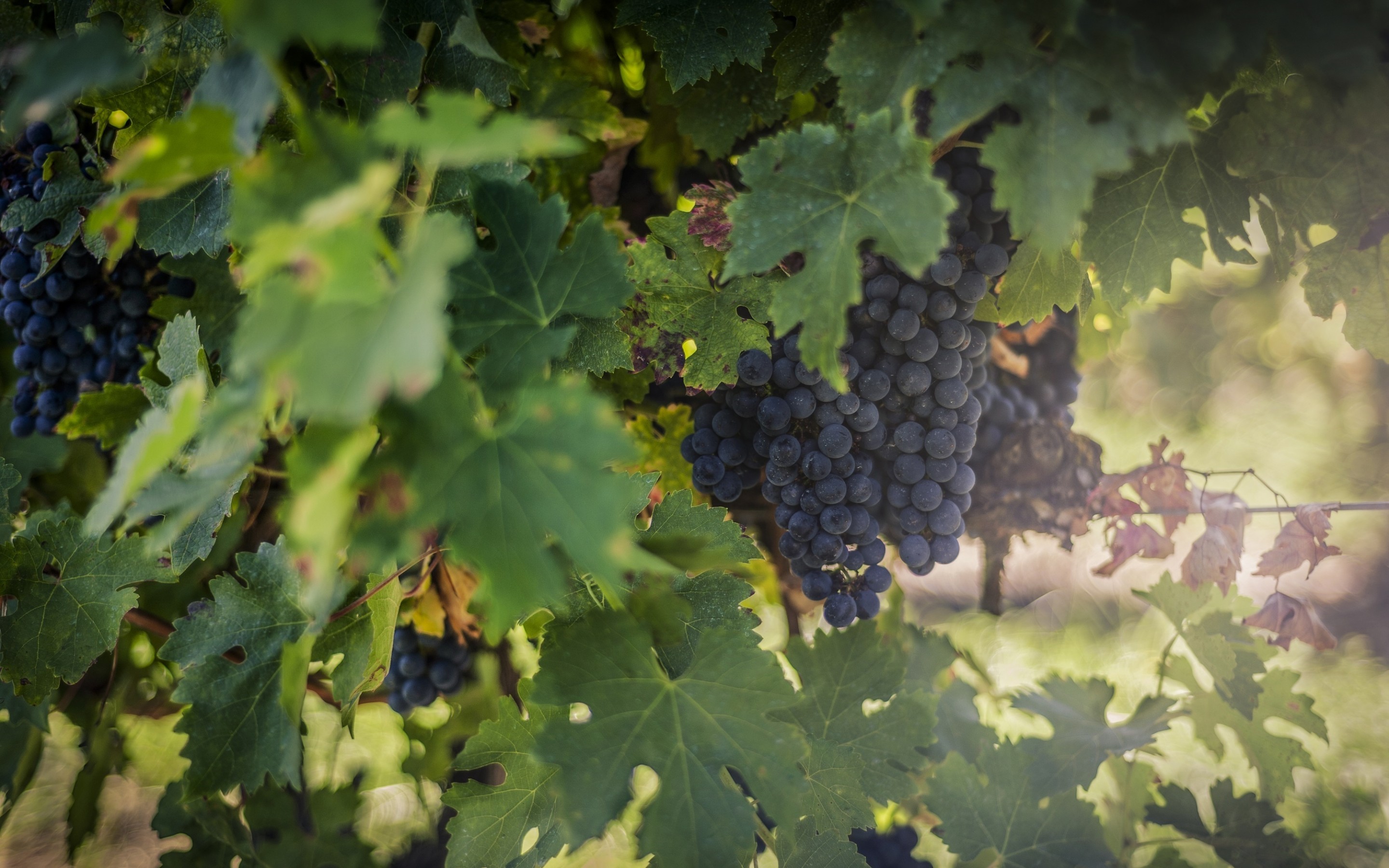 Description: A bunch of grapes hanging from a vine in a vineyard with green leaves on the vine and a blurry background.