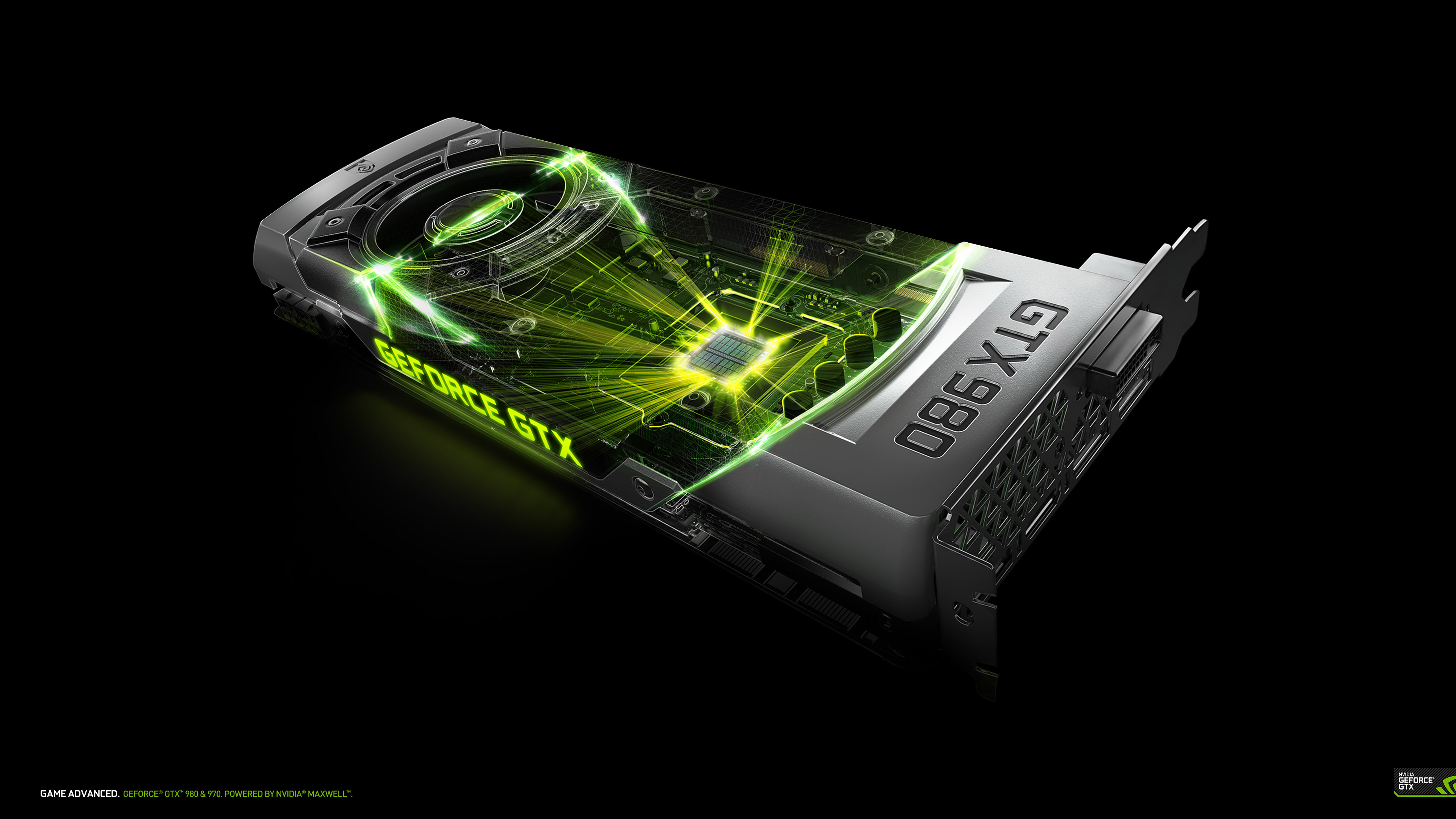 Description: A close up of a graphics card on a black background with a green light coming from it's side.