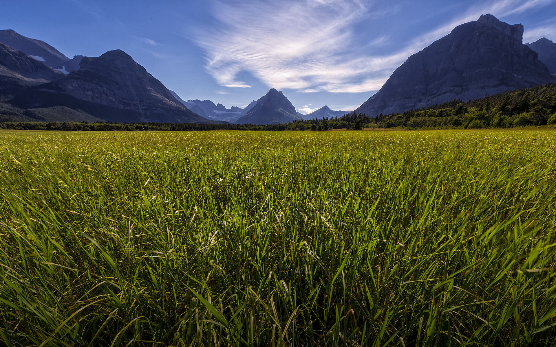 Description: A field of grass with mountains in the background and a blue sky with clouds in the distance with a few clouds in the sky.