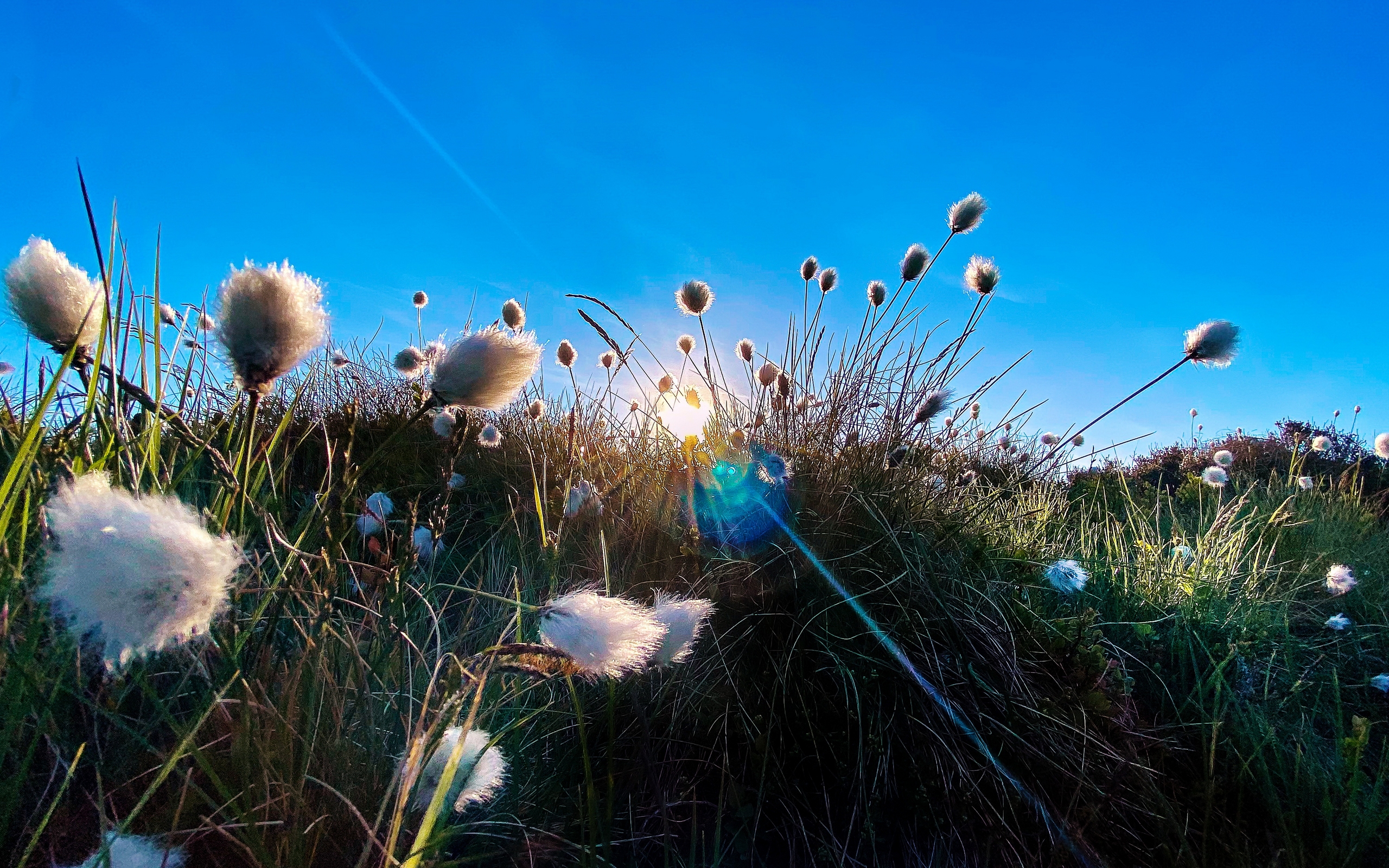 Description: A field of grass with a blue sky in the background and some white flowers in the foreground with a sun shining through the clouds.