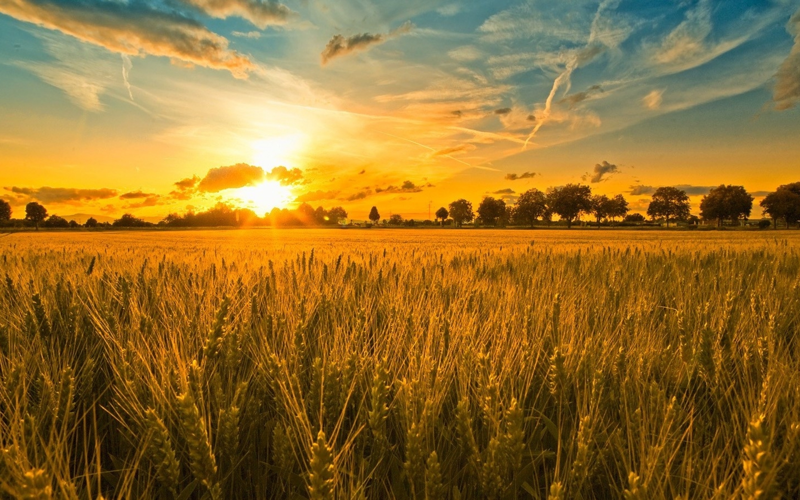 Description: A field of grass with the sun setting in the background and clouds in the sky above it.