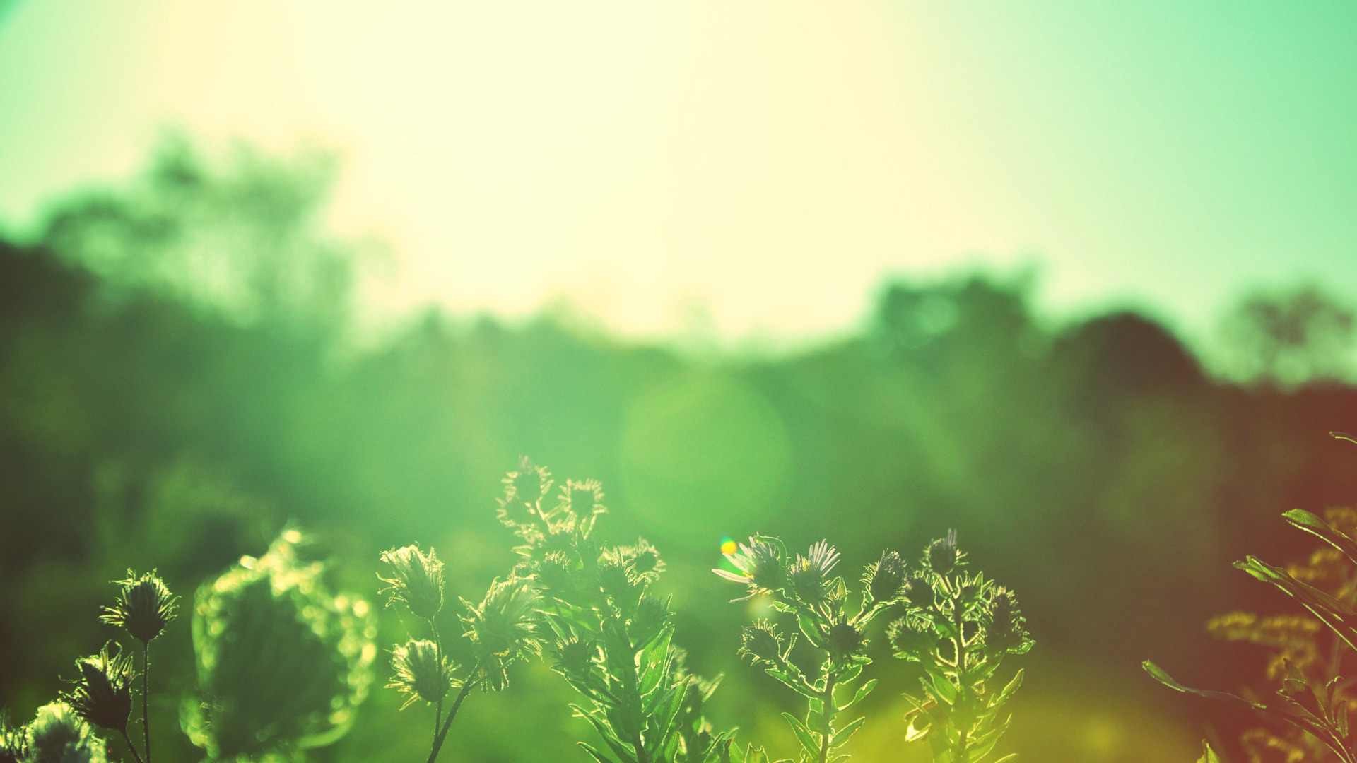 Description: A field of grass with trees in the background and a bright sun shining on the sky above it.
