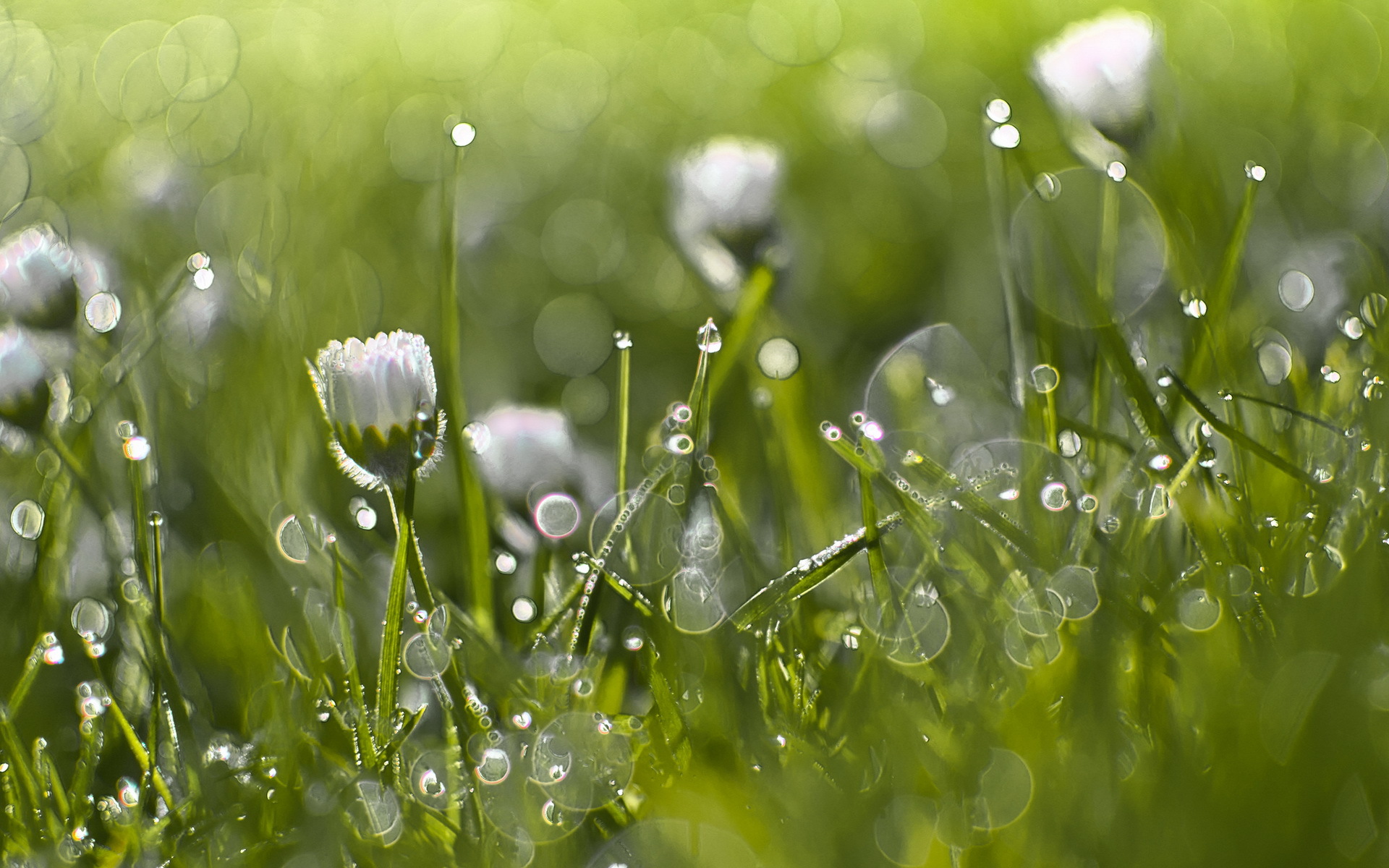 Description: A field of grass with water droplets on it and a few flowers in the background with a green grass field in the foreground.