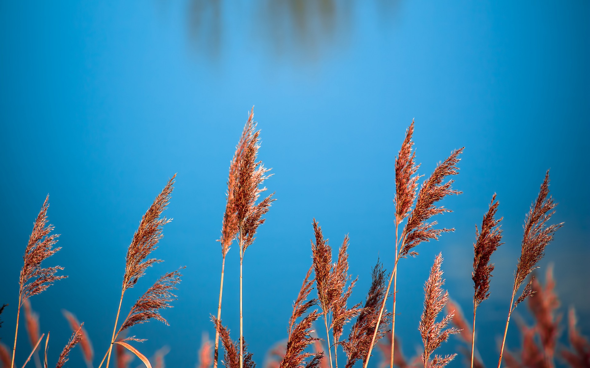 Description: A group of tall brown grass next to a body of water with a blue sky in the background and a few clouds in the distance.