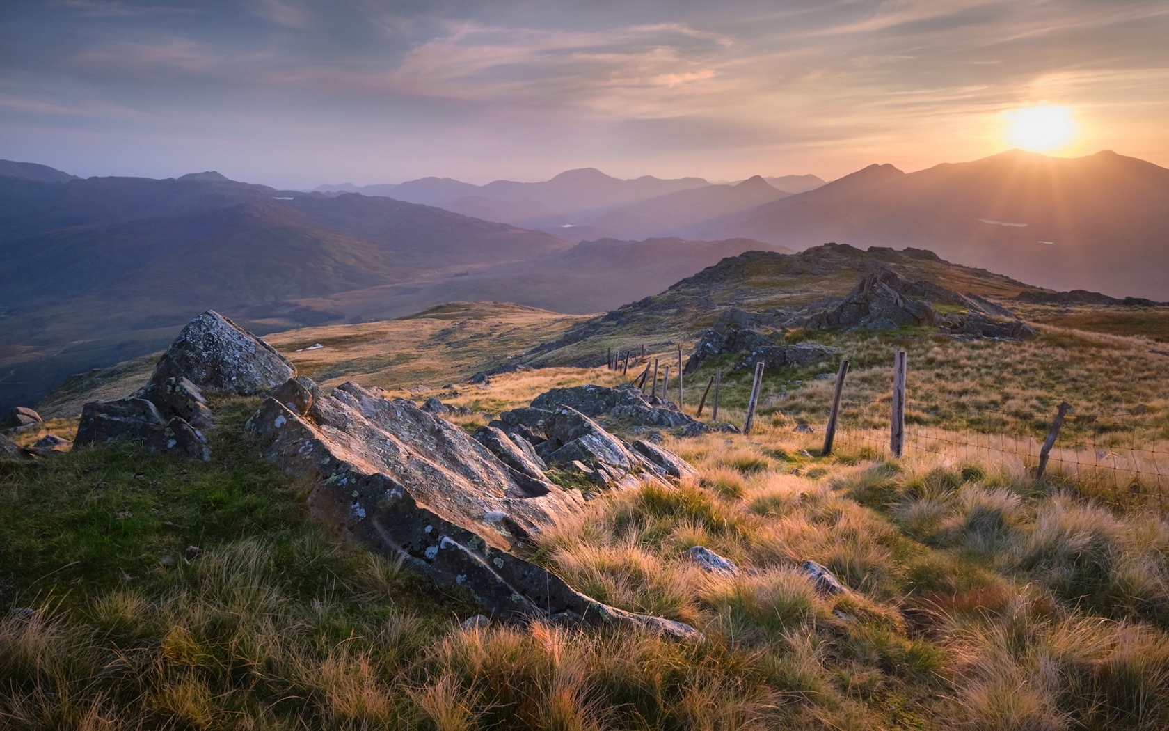 Description: A grassy field with a fence and mountains in the background at sunset with the sun setting on the horizon.