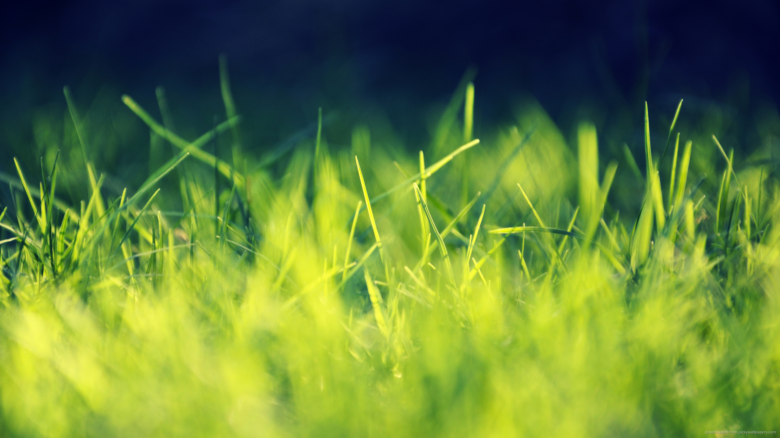 Description: A close up of a grassy field with a blurry background of grass and grass blades in the foreground.