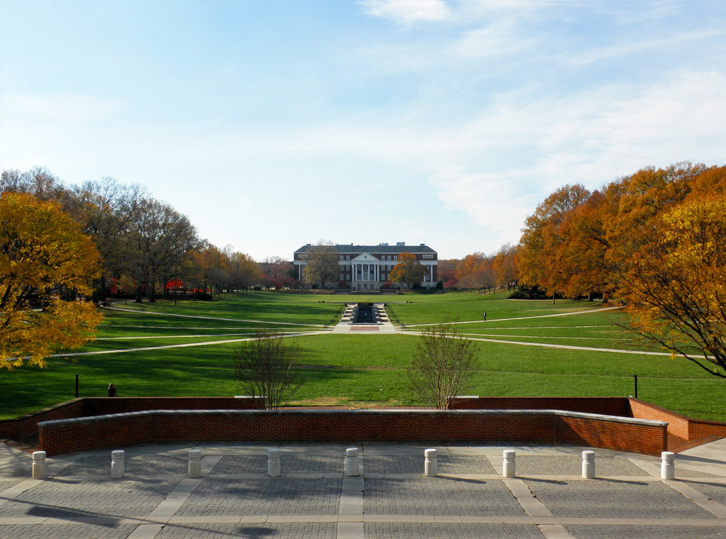 Description: A large grassy field with a building in the background and trees in the foreground with yellow leaves on the trees.