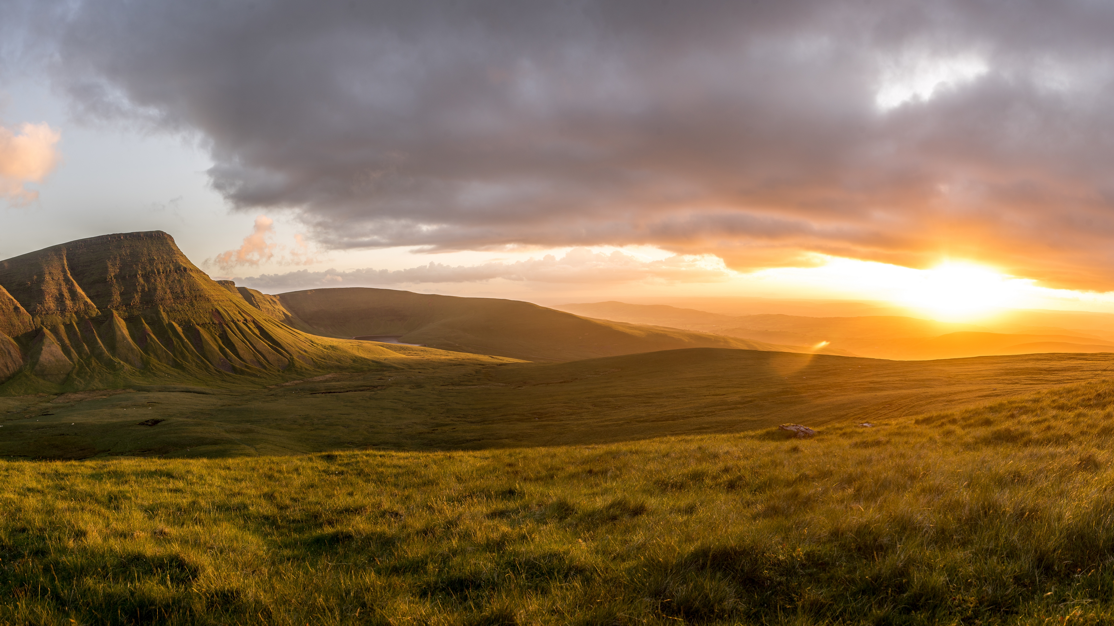 Description: A grassy field with a mountain in the background at sunset with clouds in the sky above it and a few sheep grazing in the grass below.