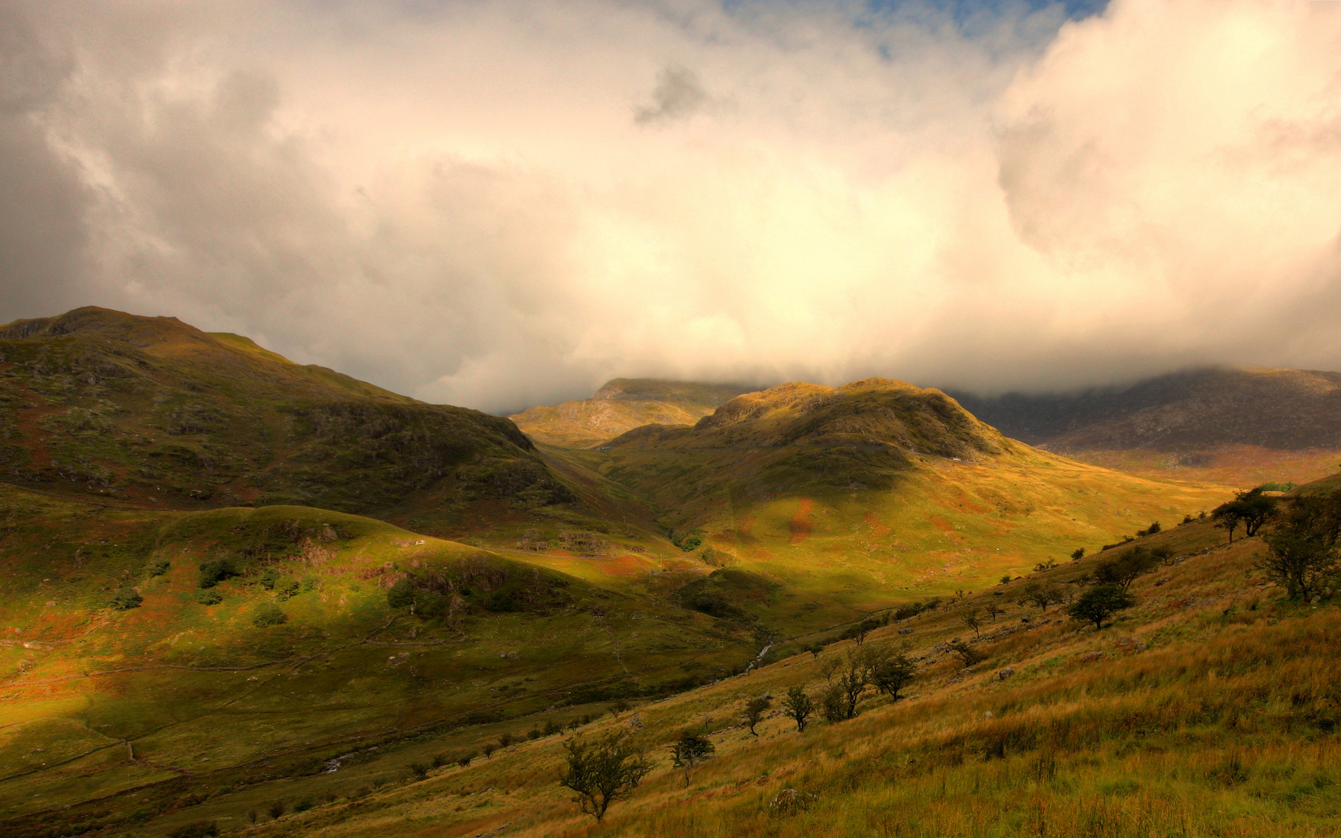 Description: A grassy field with mountains in the background under a cloudy sky with clouds in the sky above it and a few trees in the foreground.