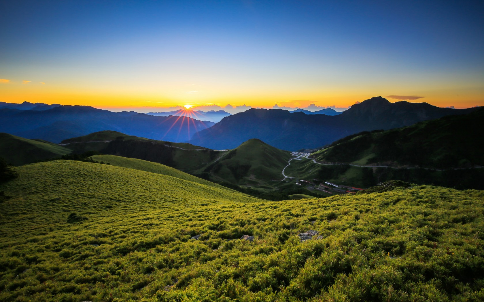 Description: A grassy field with mountains in the background at sunset with the sun setting in the distance.