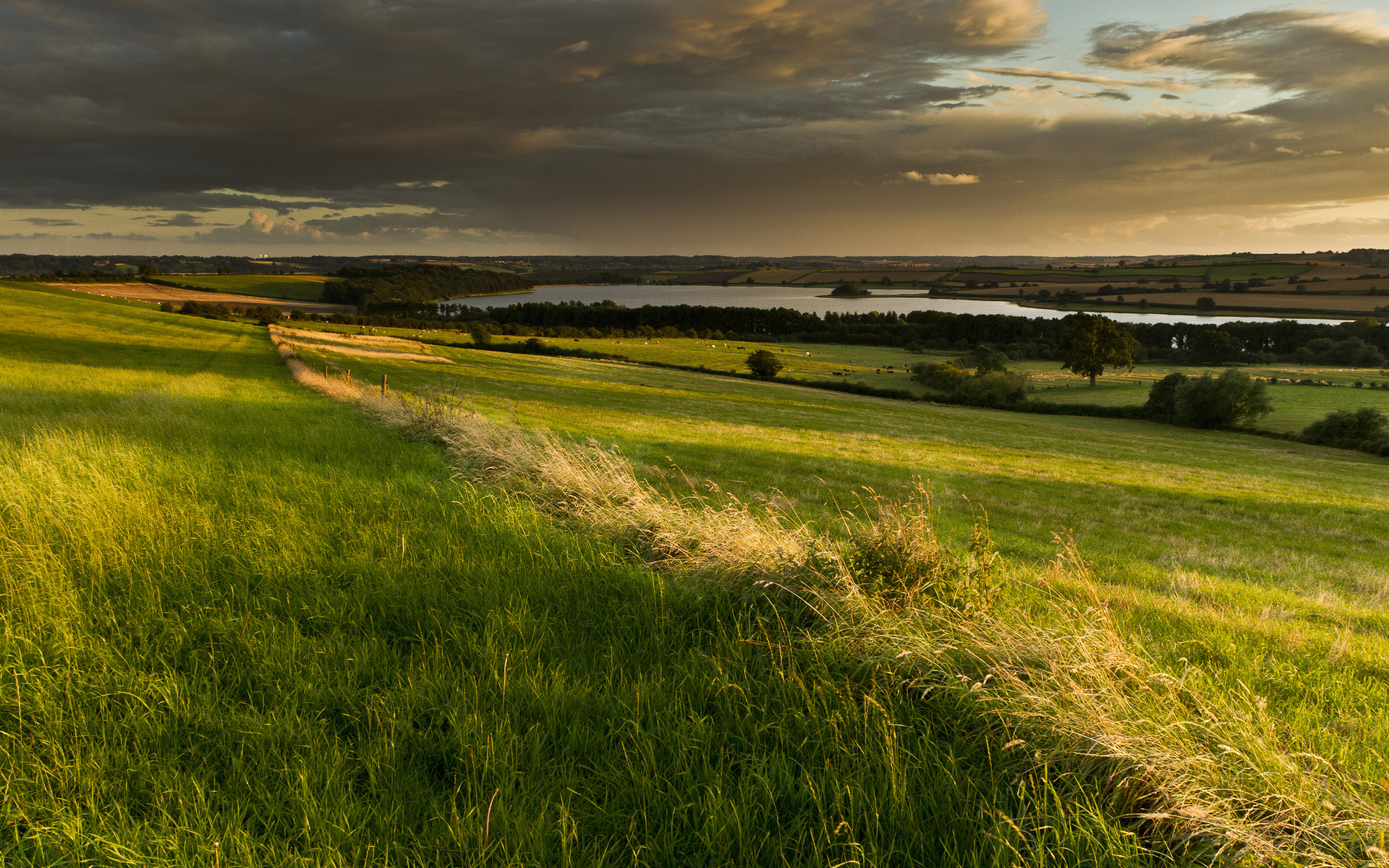 Description: A grassy field with a river in the distance and clouds in the sky above it and a grassy field with a river in the distance.