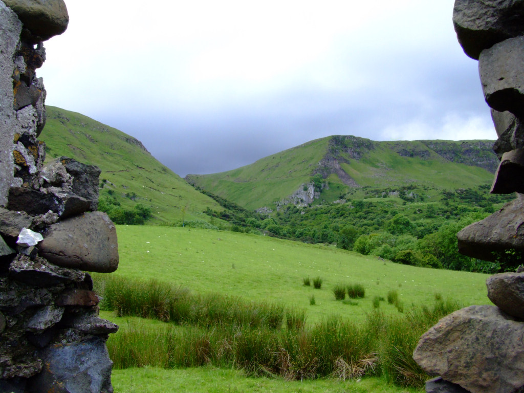Description: A view of a grassy field through a stone wall with a mountain in the background and a cloudy sky.