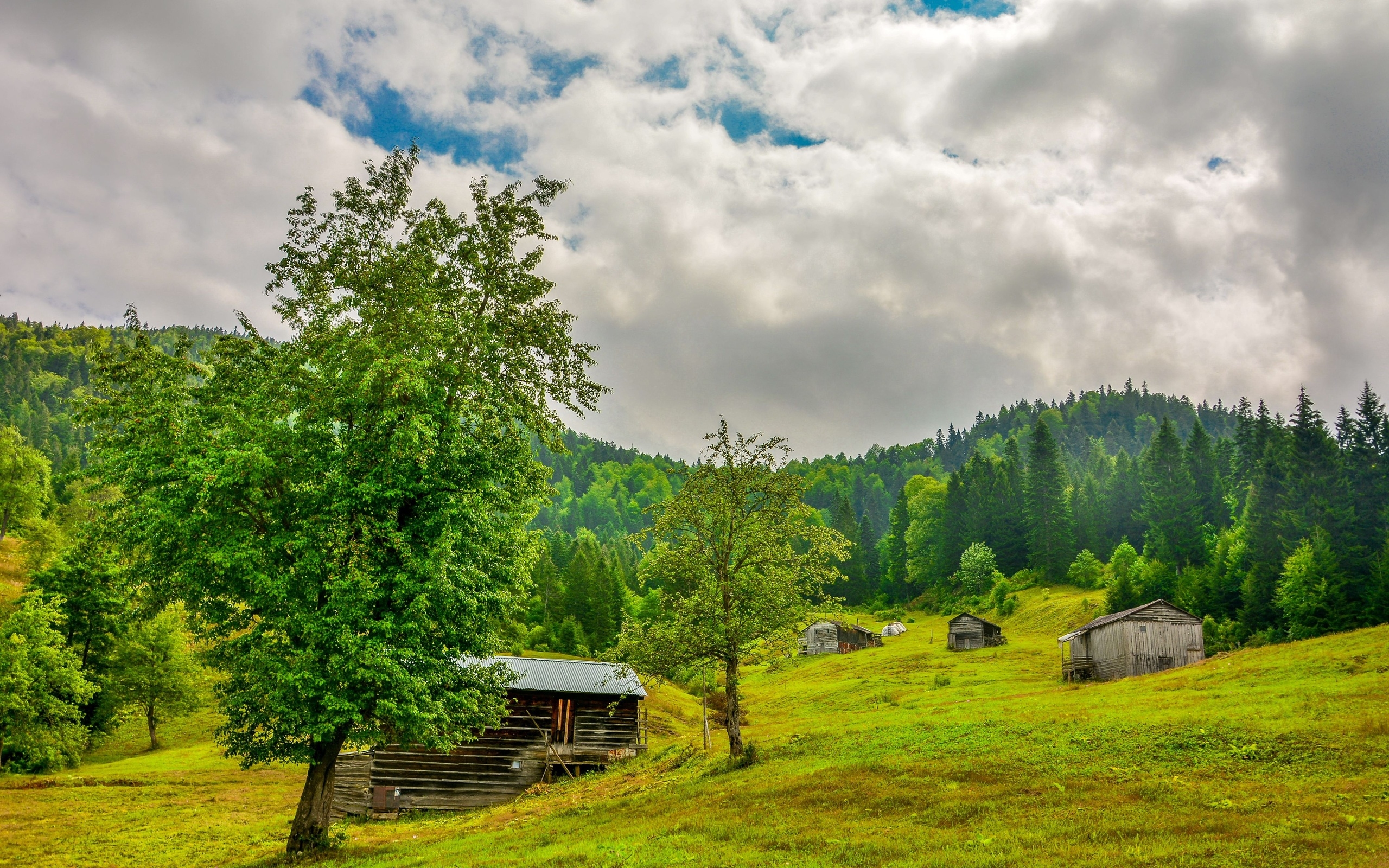 Description: A grassy field with a tree and a cabin in the distance with a cloudy sky above it and a few trees in the foreground.