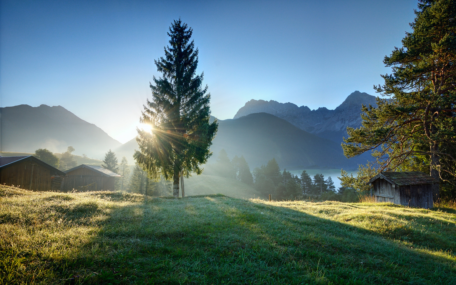 Description: A grassy field with a tree and a mountain in the background with the sun shining through the trees and the grass.
