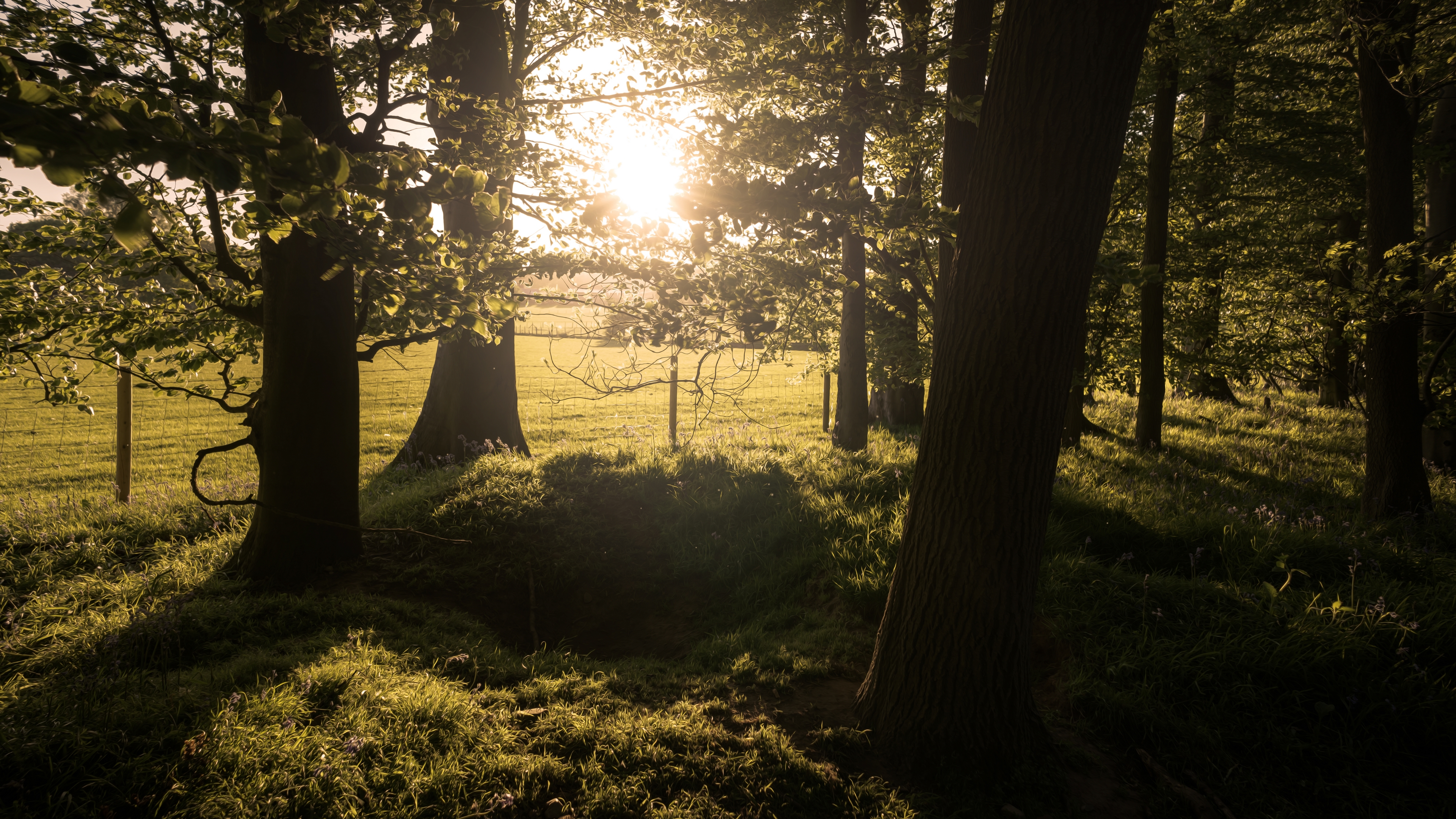 Description: A grassy field with trees and a fence in the background at sunset or sunrise or sunset in the distance.