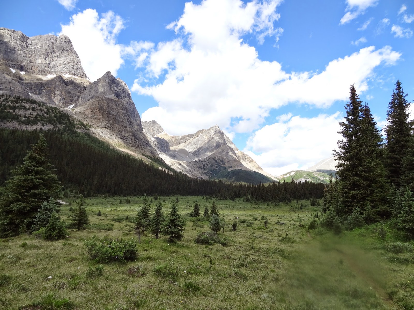 Description: A grassy field with trees and mountains in the background with a blue sky with clouds above it and a trail running through the grass.