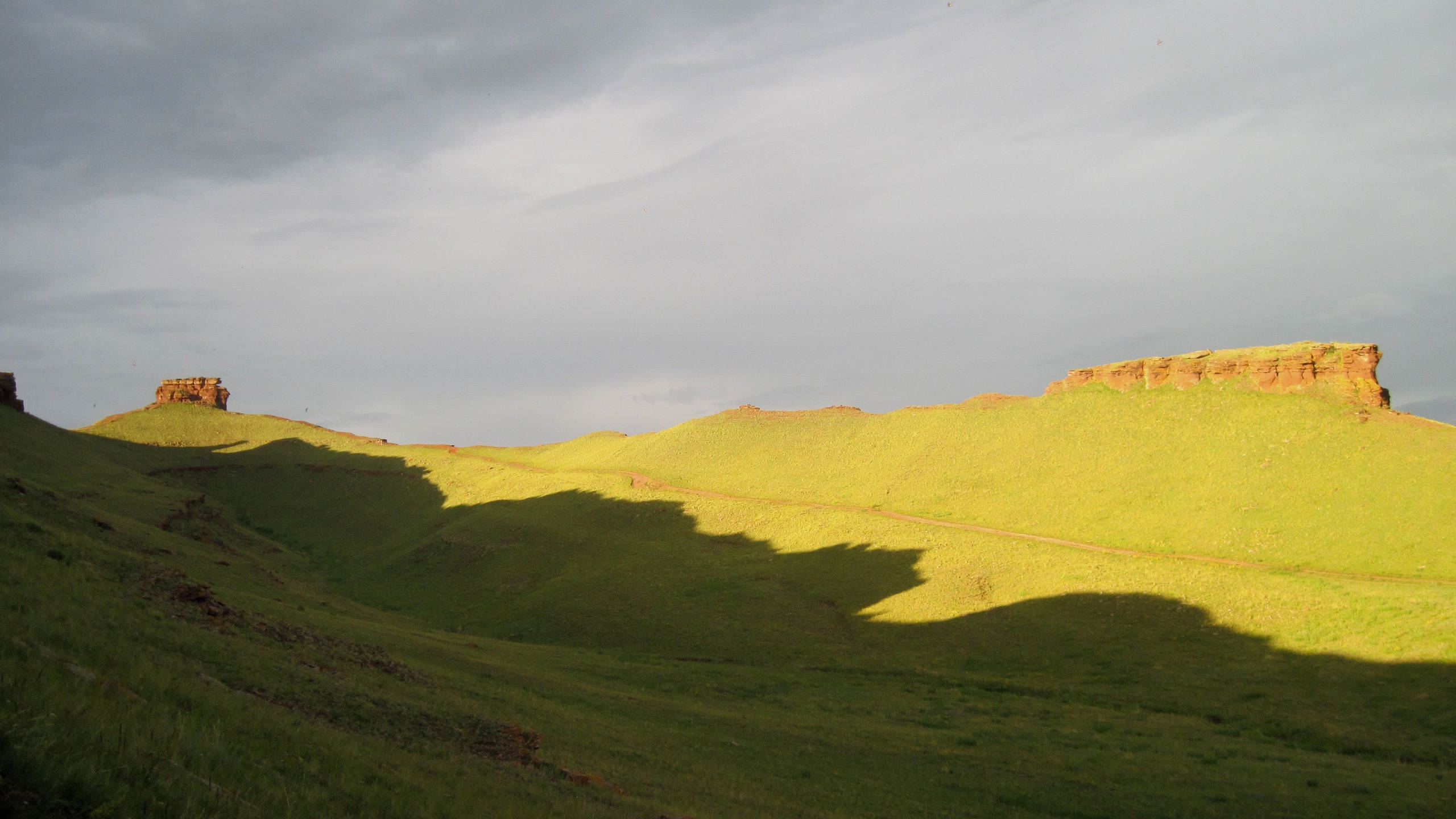 Description: A grassy hill with a few hills in the background and a sky with clouds above it and a few hills in the foreground.