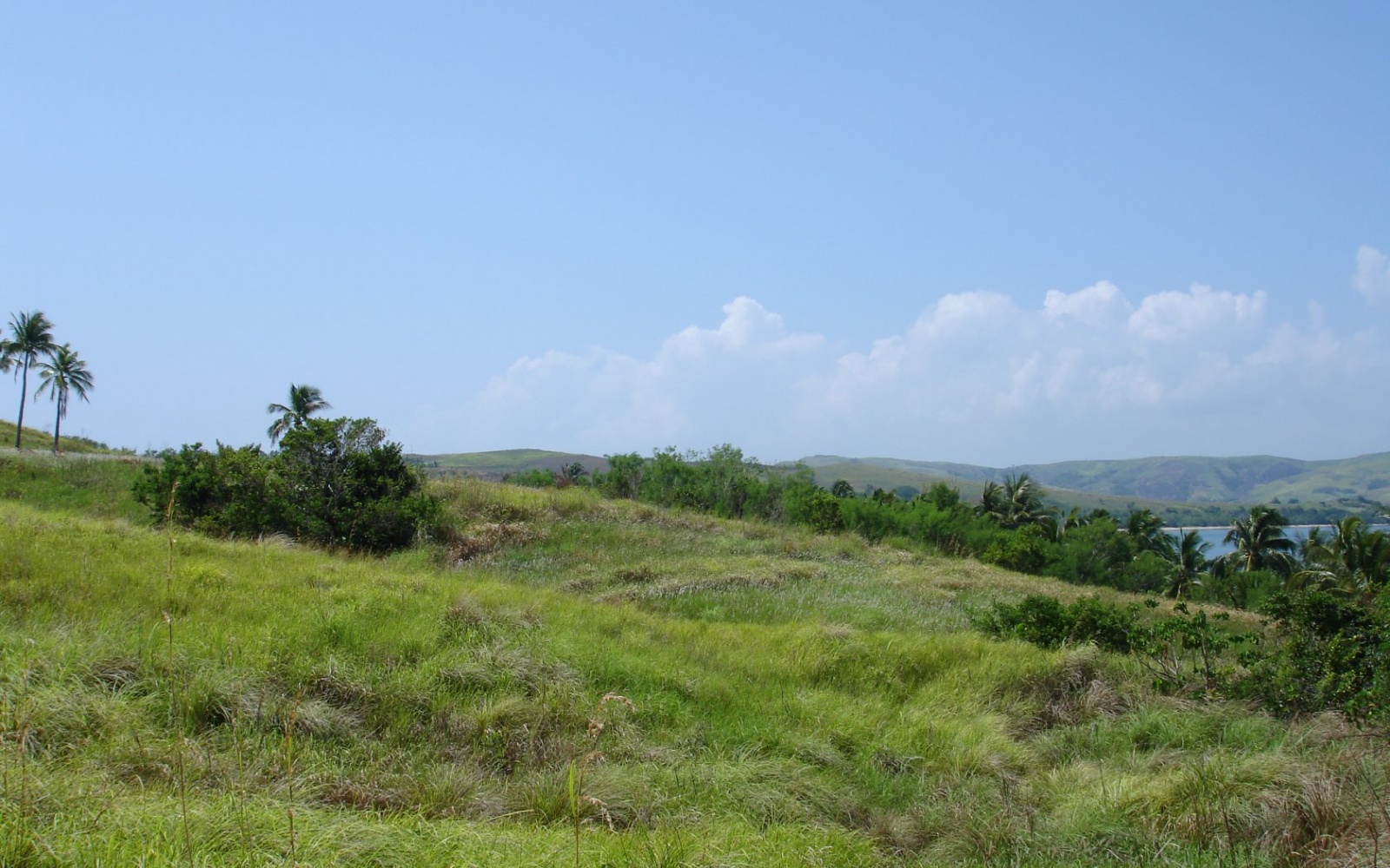 Description: A grassy hill with a lake in the distance and palm trees on the other side of the hill.