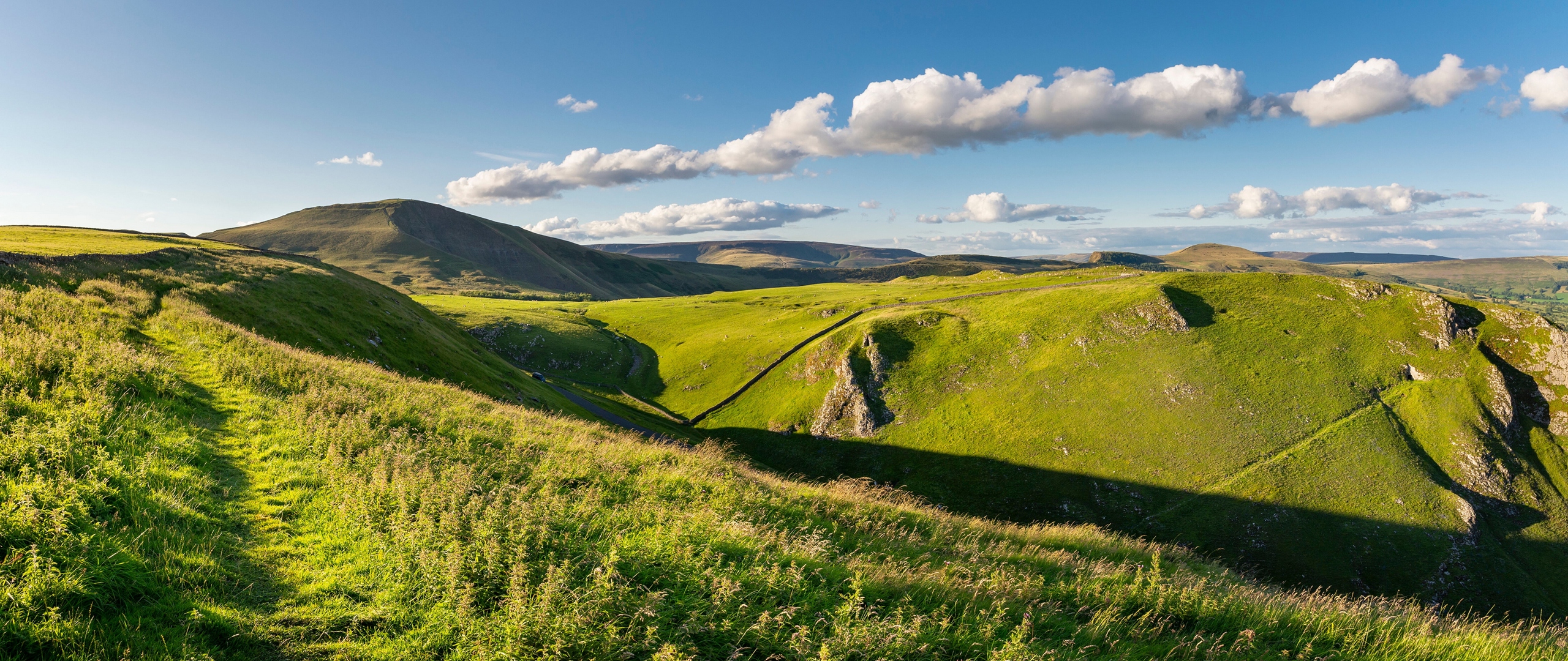 Description: A grassy hill with a few hills in the distance and clouds in the sky above it.