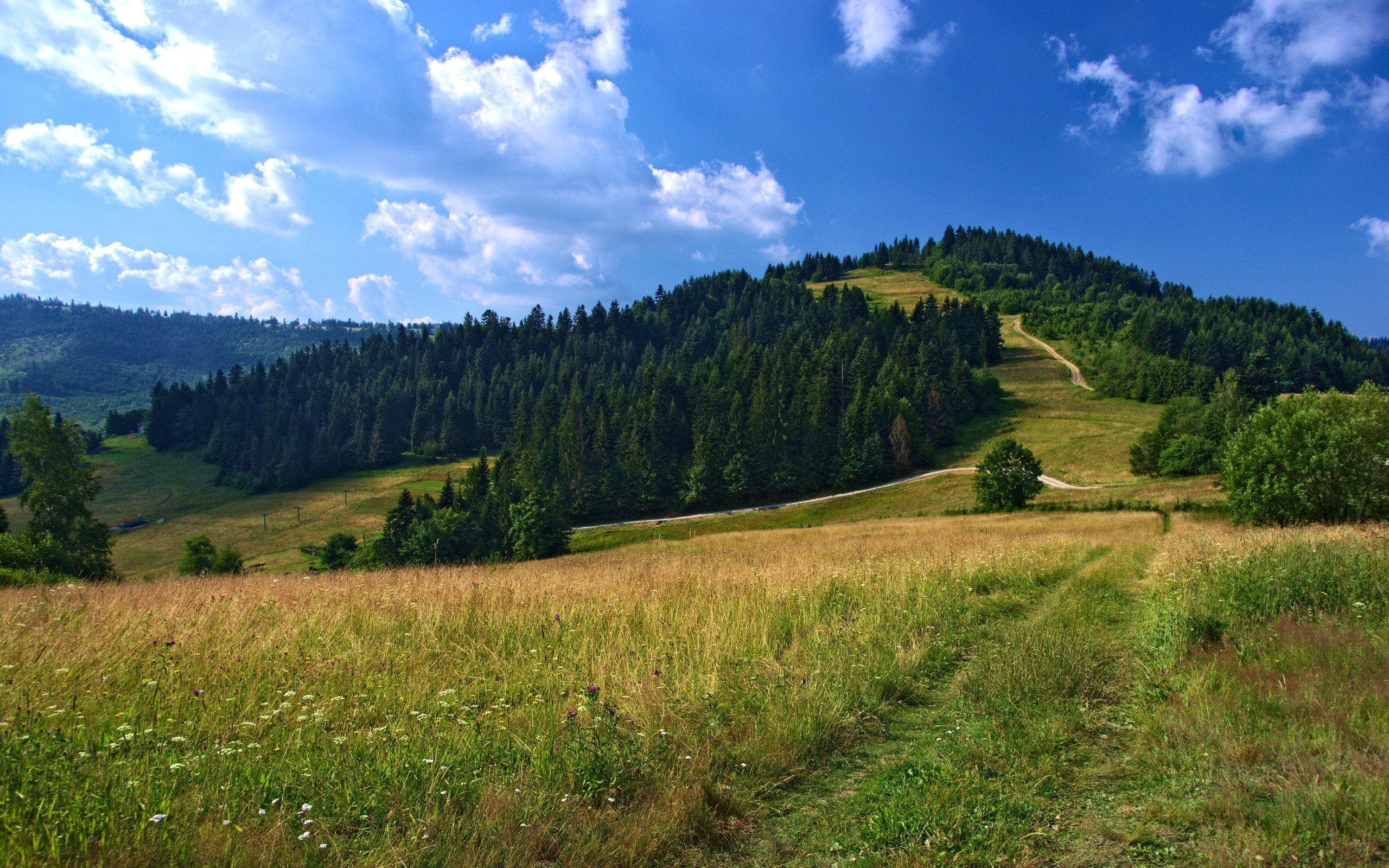 Description: A grassy field with a hill in the background and trees on the hill side in the distance.