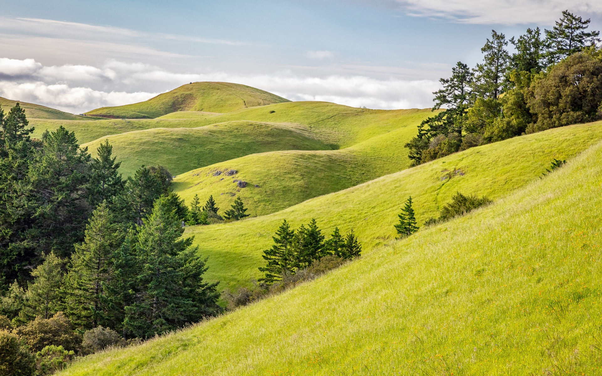 Description: A grassy hill with trees on the side of it and a cloudy sky above it with clouds in the distance.